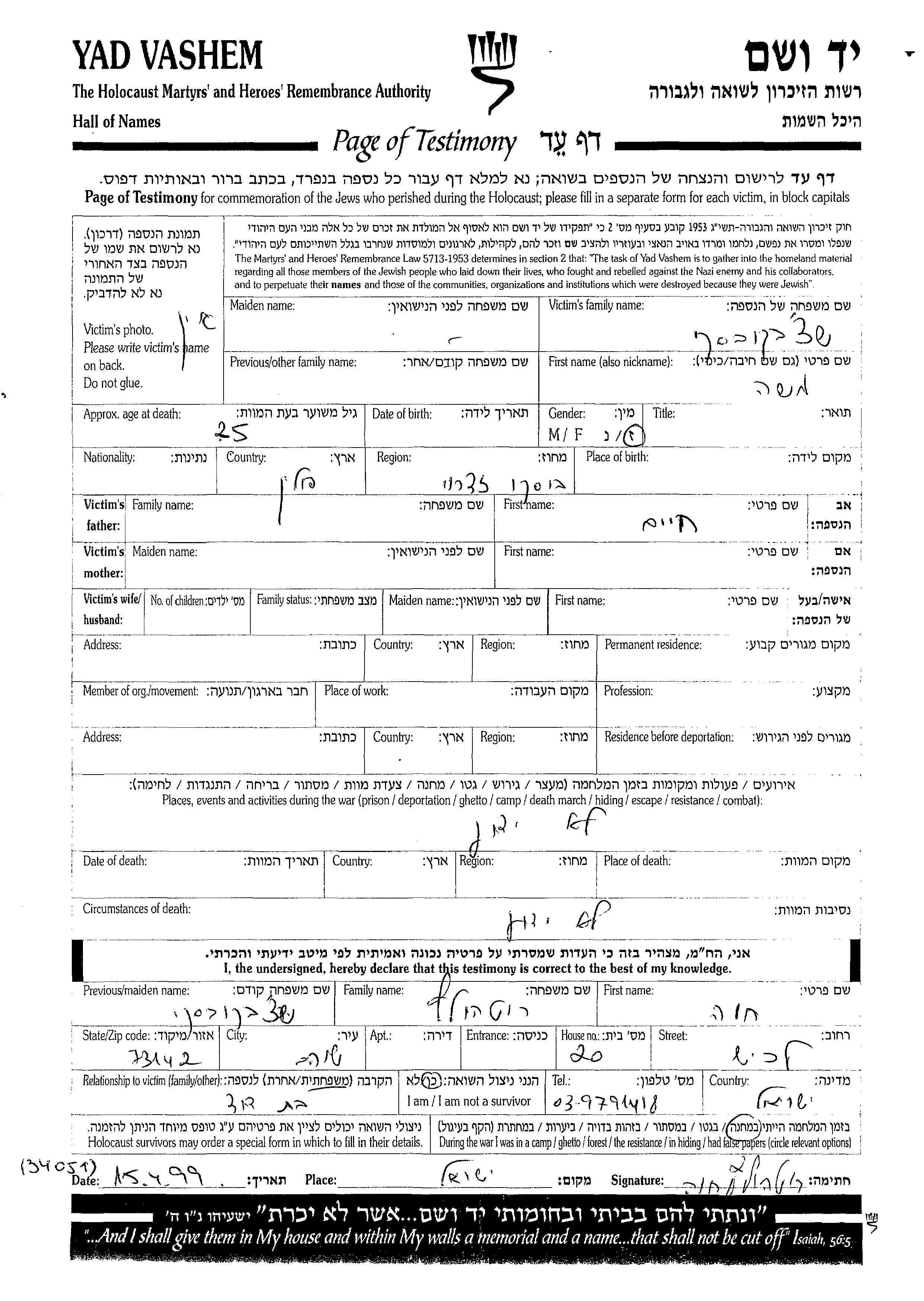 Yad Vashem - Pages of Testimony Names Memorial Collection