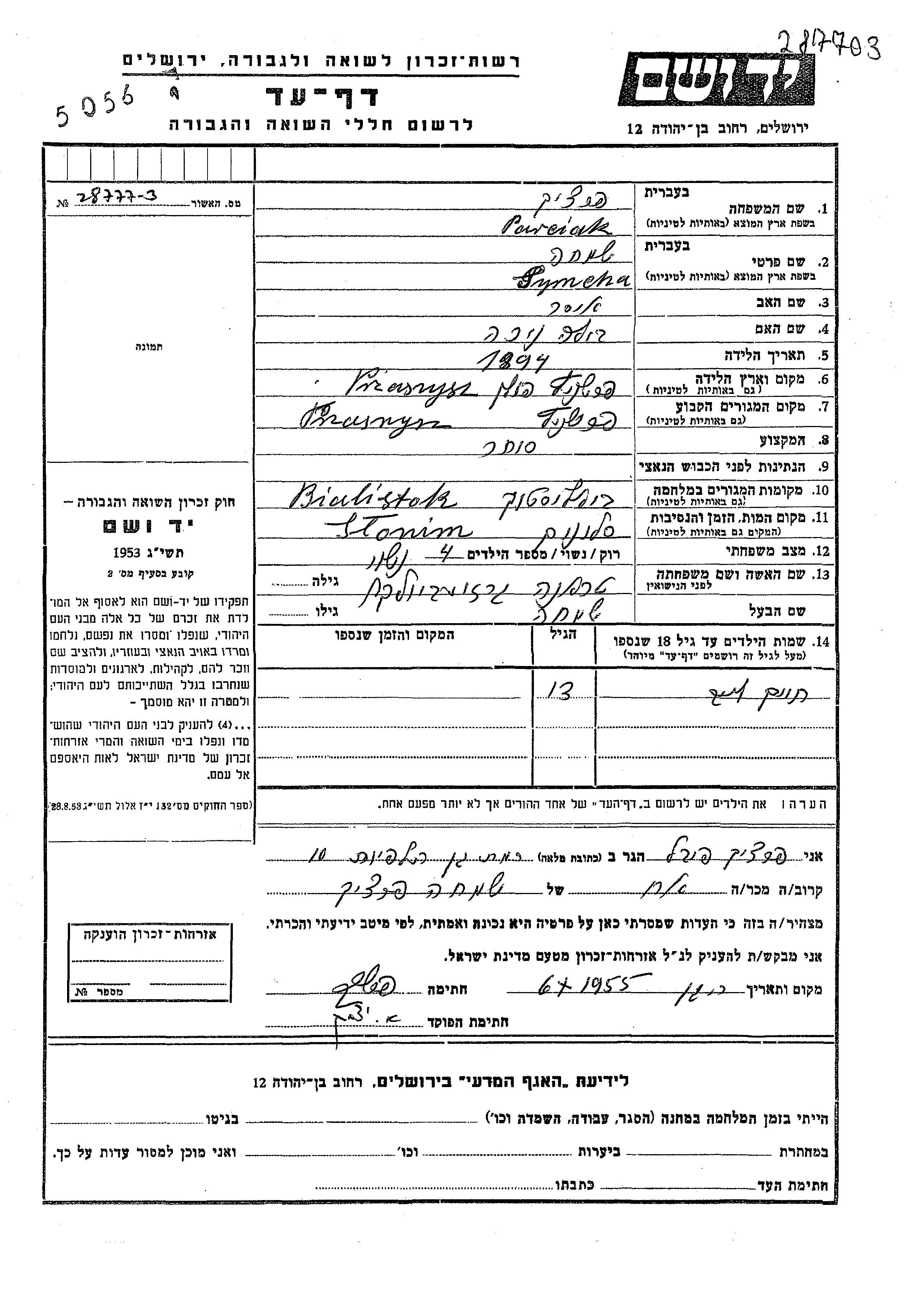 Sjmcha Parciak Fertzik was born in Przasnysz, Poland, 1894 to Isser and Bila Nikha. He was a merchant and married to Trana nee Grzebiolka. Prior to WWII he lived in Przasnysz, Poland. During the war he was in Bialistok, Poland. Sjmcha was murdered in the Shoah. Place of death: Slonim, Poland.