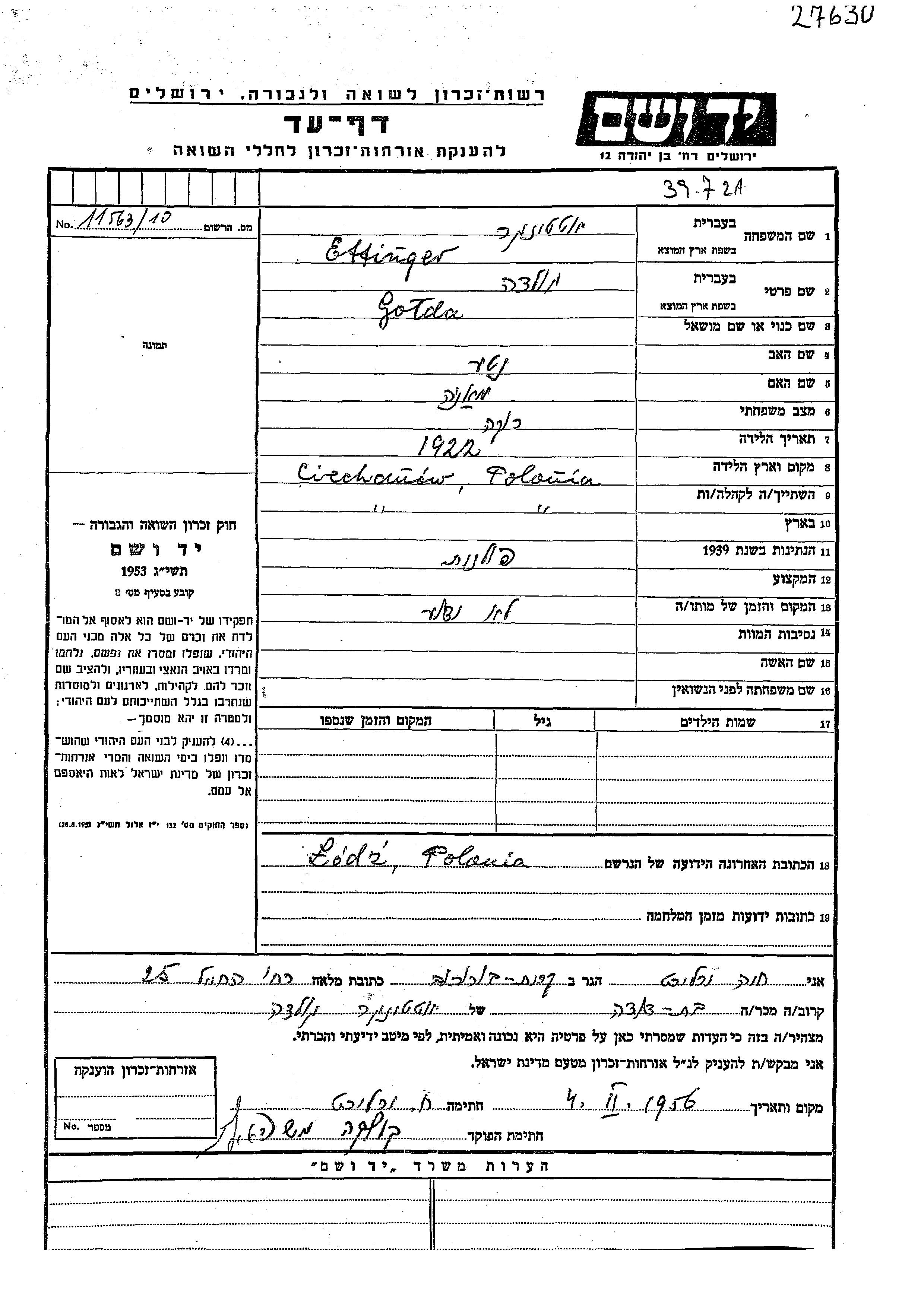 Ettinger Golda 1922 Ciechanow, Poland Page of Testimony