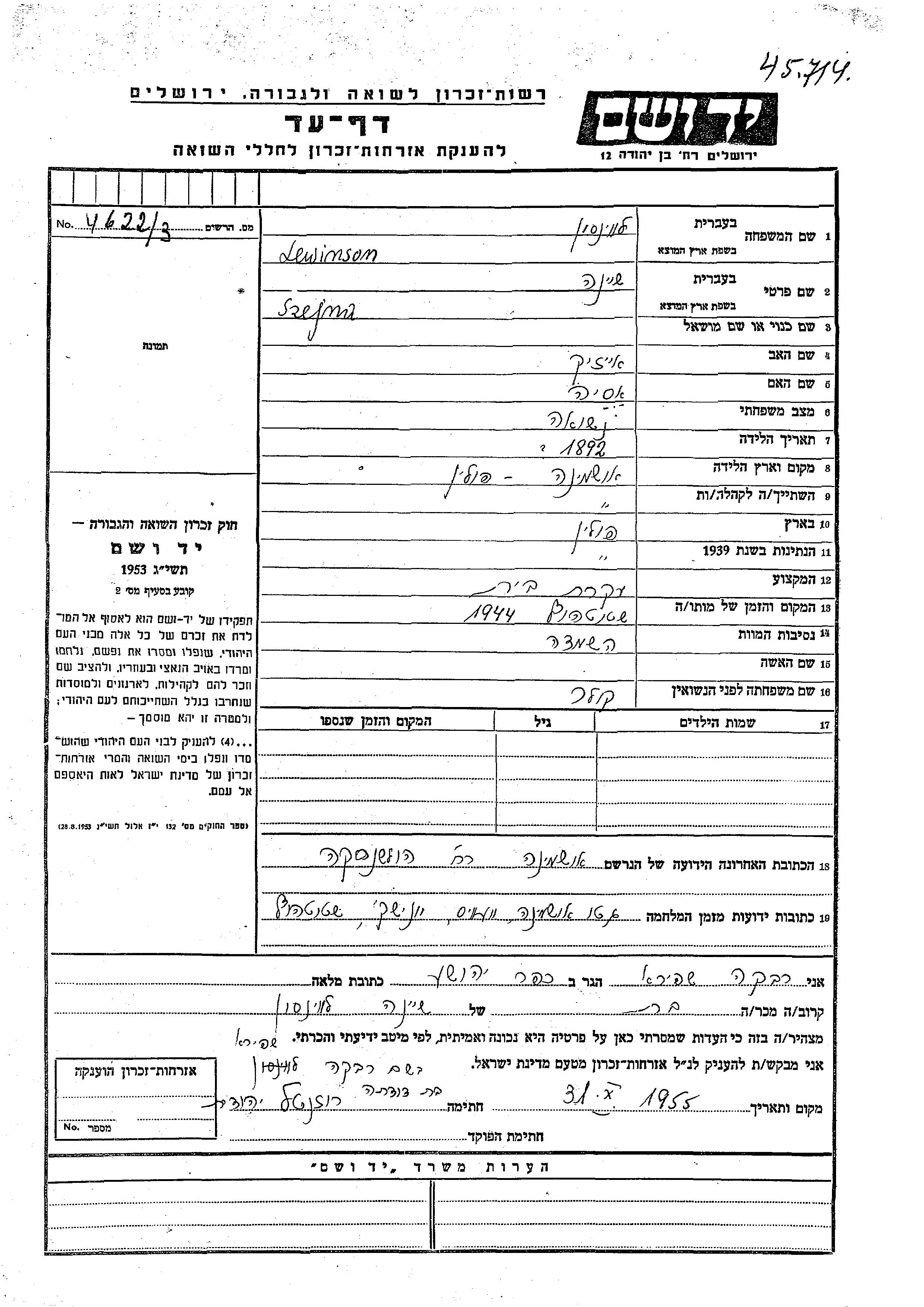 Szejna Lewinson nee Koler was born in Oszmiana, Poland, 1892 to Aizek and Asia. She was a housewife and married. Prior to WWII she lived in Oszmiana, Poland. During the war she was in Oszmiana, Poland. Szejna was murdered in the Shoah. Place of death: Stutthof, Free City of Danzig, 1944.