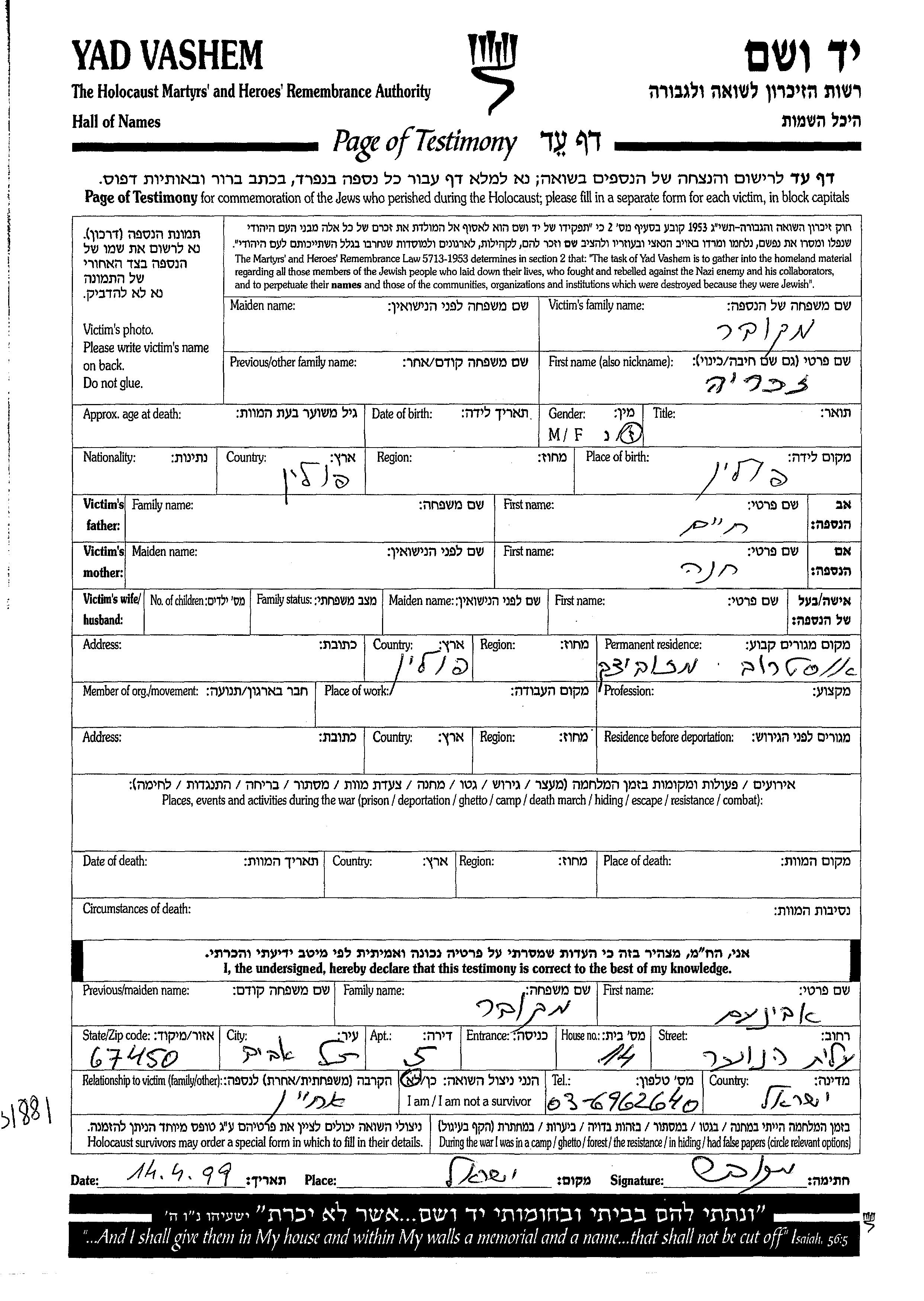 Yad Vashem - Pages of Testimony Names Memorial Collection