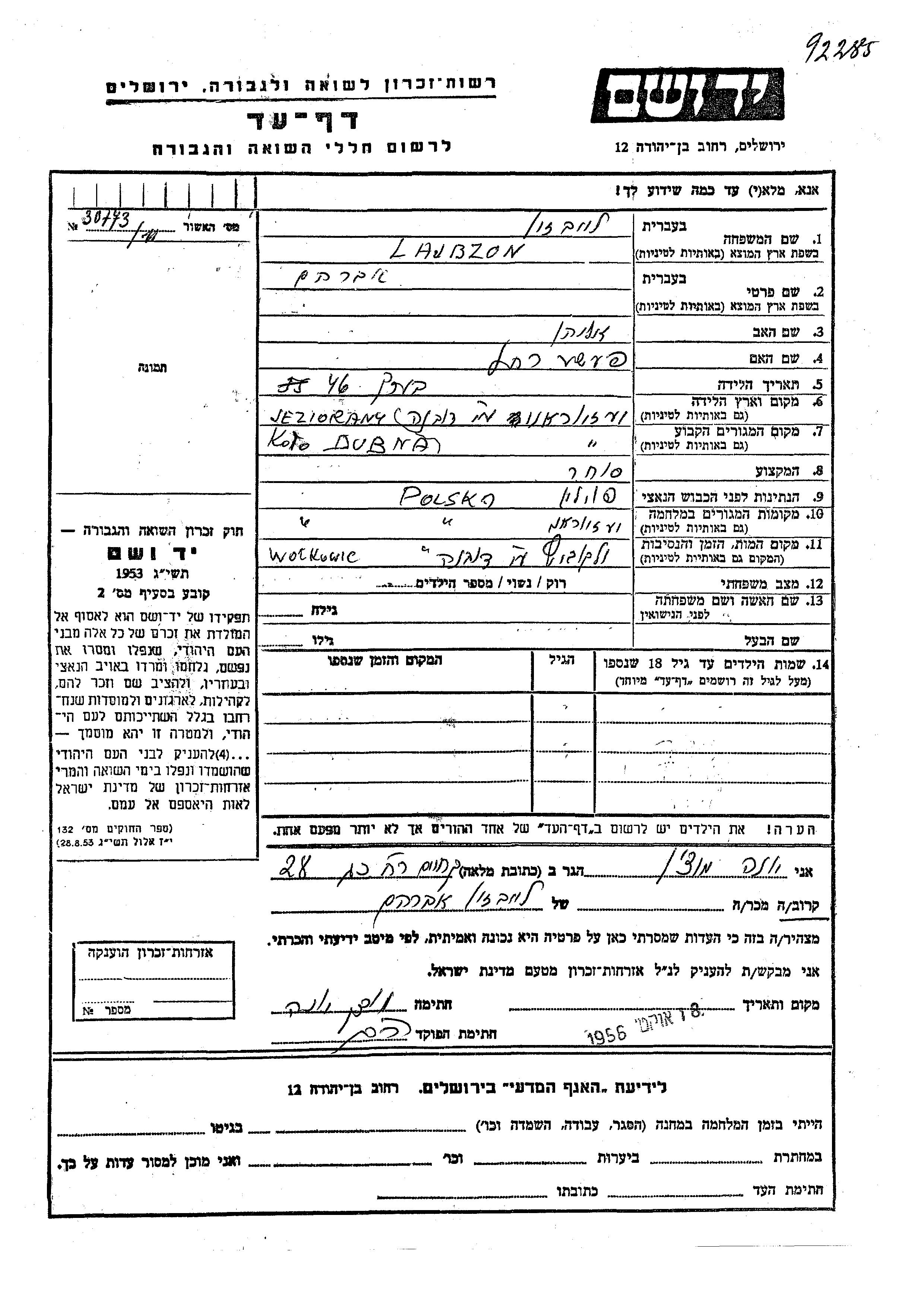 Avraham Lajbzon was born in Jeziorany, Poland to Eliahu and Peshe Rakhel. He was a merchant. Prior to WWII he lived in Jeziorany, Poland. During the war he was in Jeziorany, Poland. Avraham was murdered in the Shoah. Place of death: Wolkowysk, Poland.