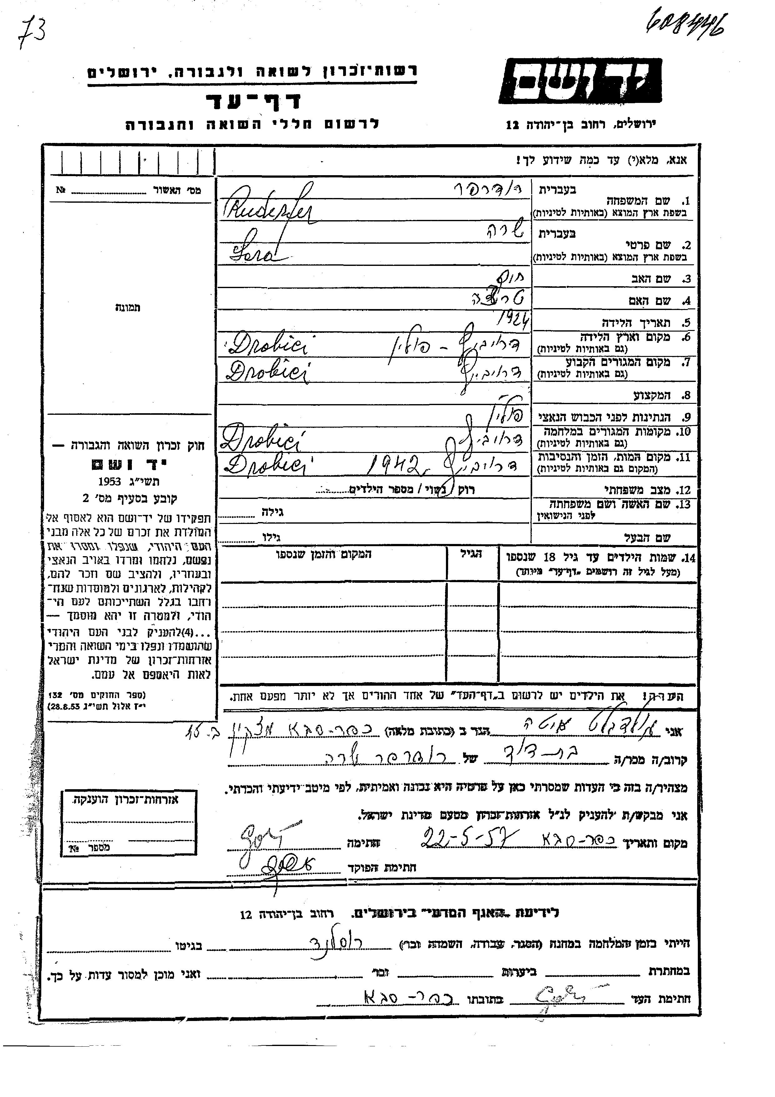 Ruderfer Sara 1924 Drobich, Poland Page of Testimony