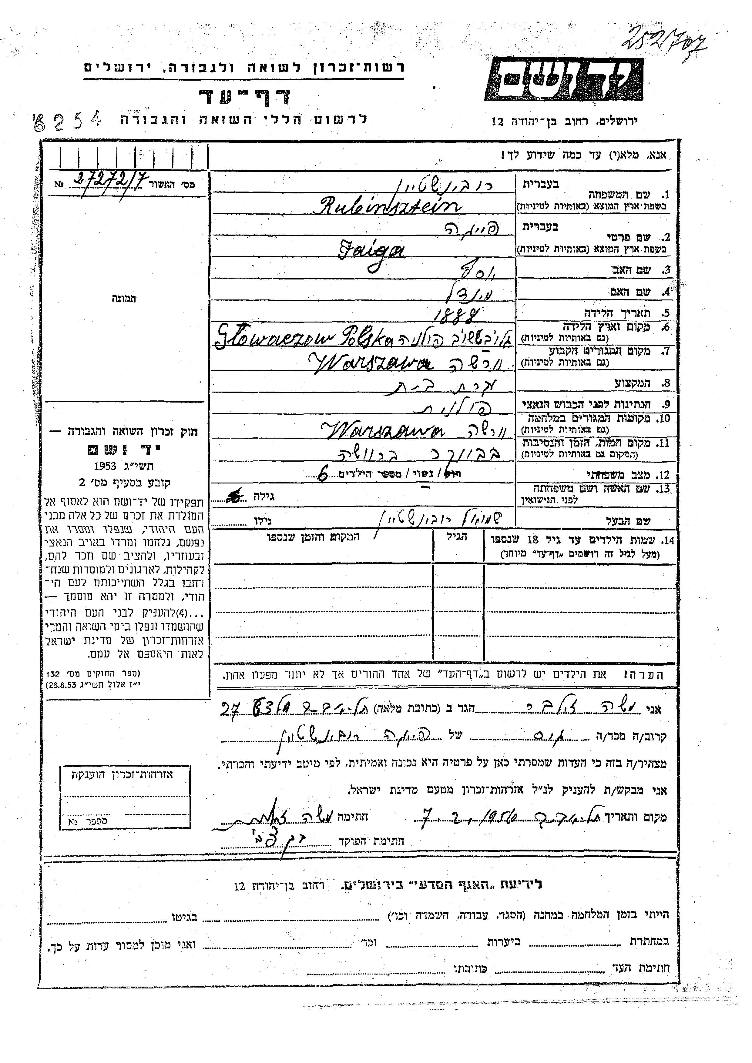 Faiga Rubinsztein was born in Glowaczow, Poland, 1888 to Yosef and Mindl. She was a housewife and married to Shmuel. Prior to WWII she lived in Warszawa, Poland. During the war she was in Warszawa, Poland. Faiga was murdered in the Shoah. Place of death: Warszawa, Poland.