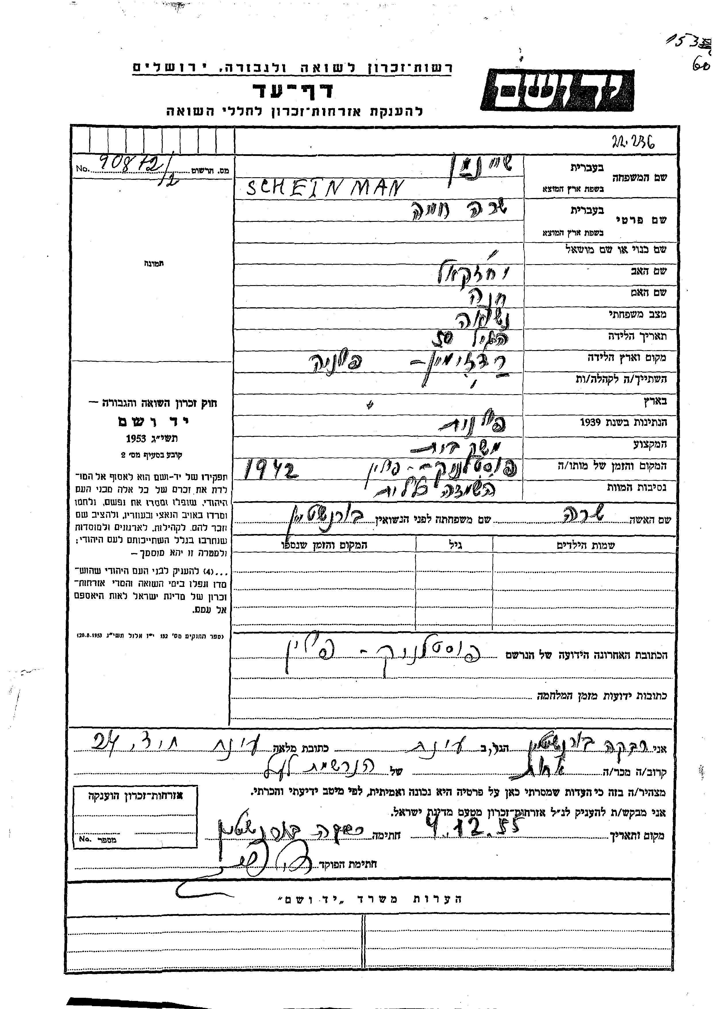 Sara Khaia Scheinman nee Bornshtein was born in Radzymin, Poland to Yekhezkel and Khana. She was a household and married. Prior to WWII she lived in Pustelnik, Poland. Sara Khaia was murdered in the Shoah. Place of death: Pustelnik, Poland, 1942.