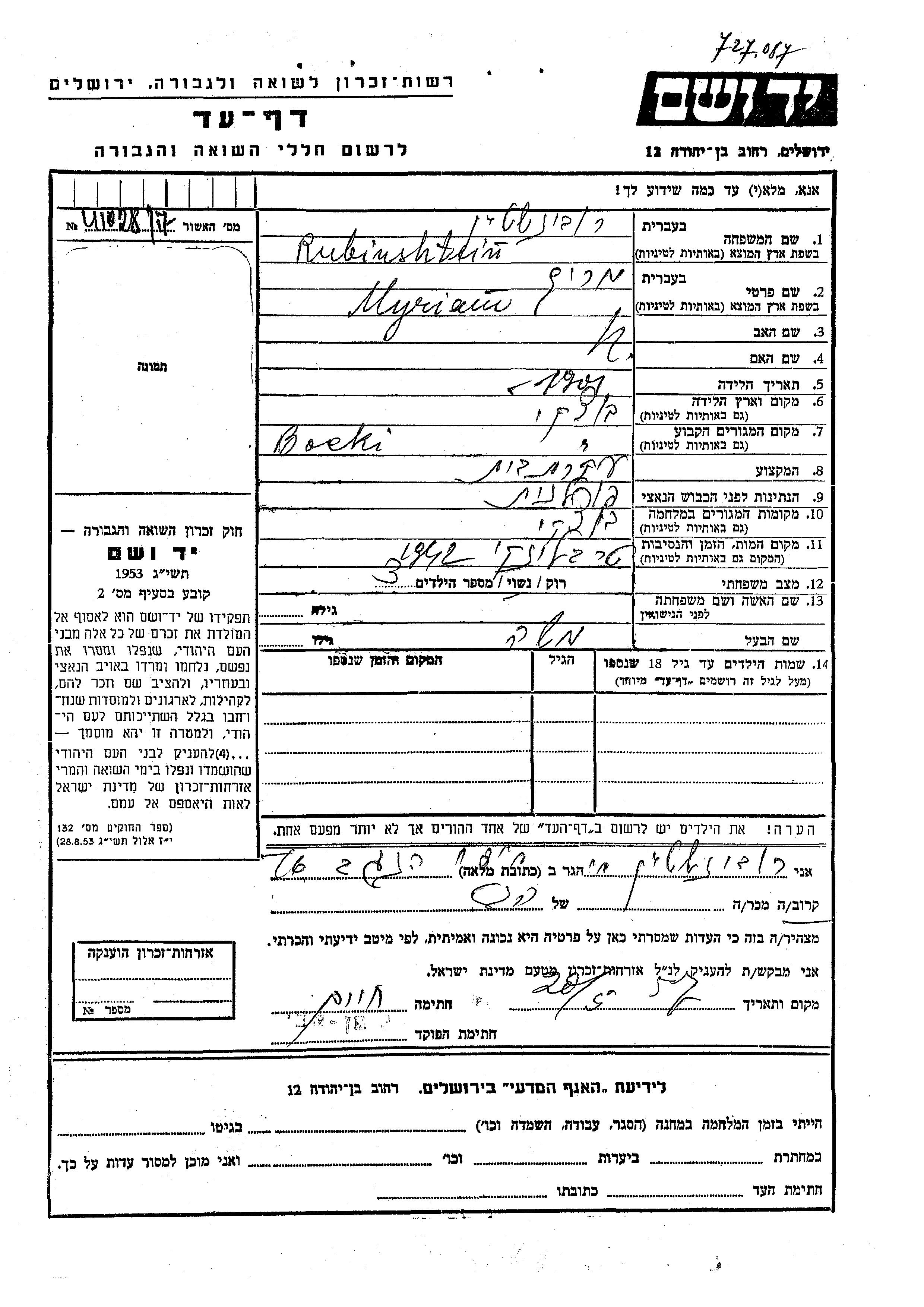 Myriam Rubinshtein was born in Bocki, Poland, 1901. She was a housewife and married to Moshe. Prior to WWII she lived in Bocki, Poland. During the war she was in Bocki, Poland. Myriam was murdered in the Shoah. Place of death: Treblinka, Poland, 1942.