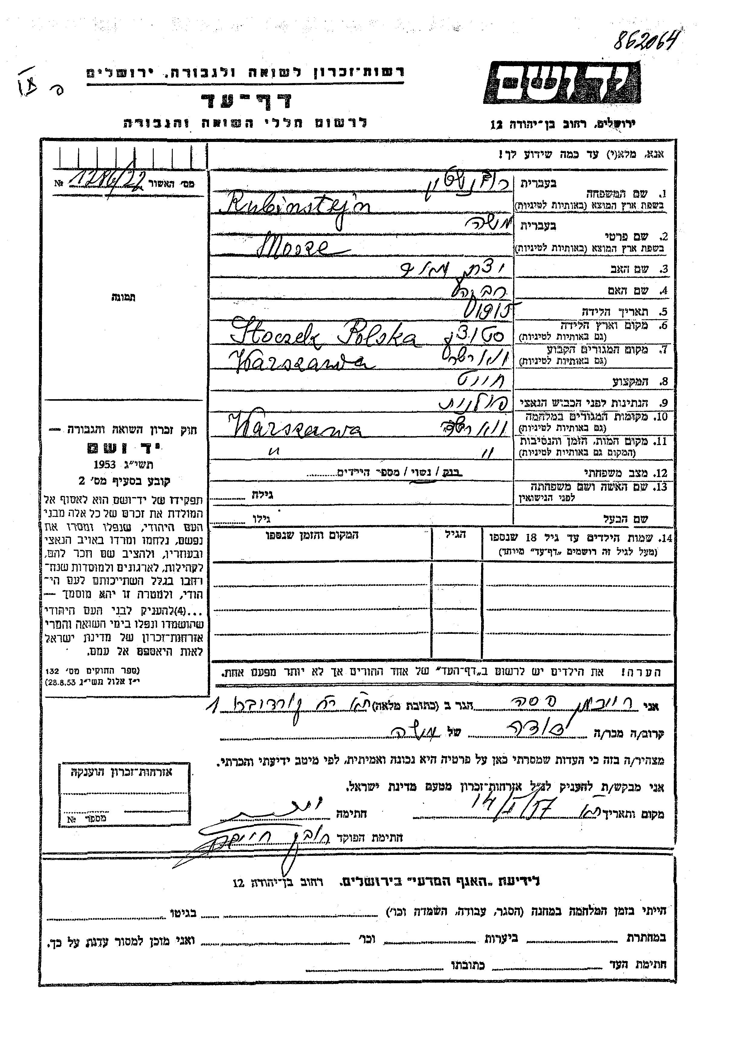 Mosze Rubinstejn was born in Stoczek, Poland, 1915 to Yitzkhak Meir and Rivka. He was a tailor and married. Prior to WWII he lived in Warsaw, Poland. During the war he was in Warsaw, Poland. Mosze was murdered in the Shoah. Place of death: Warsaw, Poland.