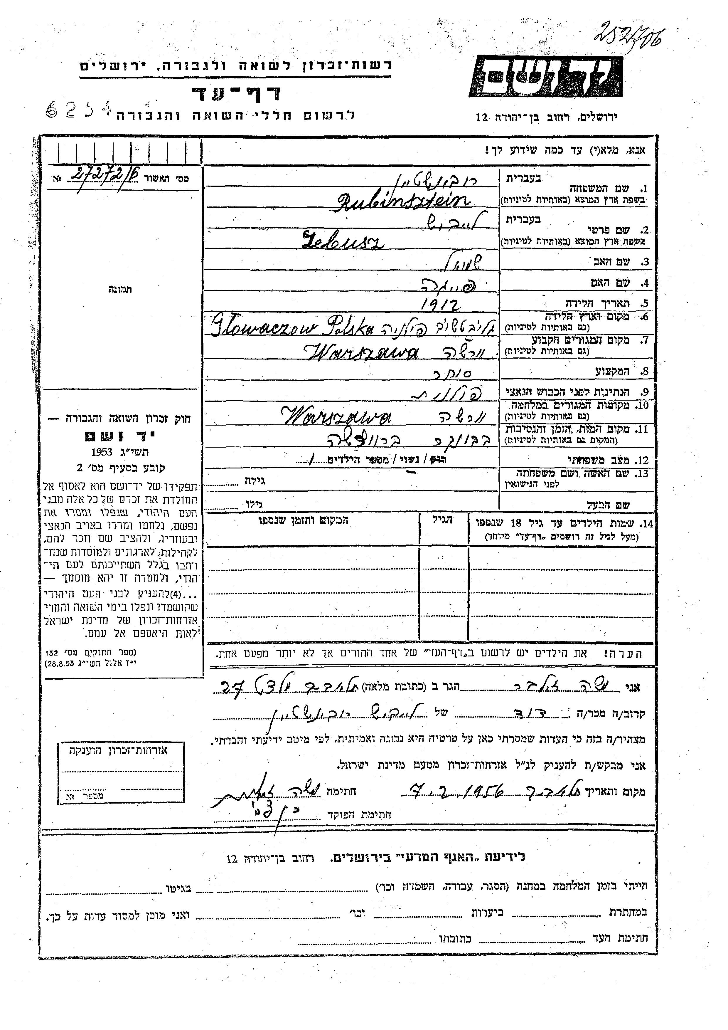 Lebusz Rubinsztein was born in Glowaczow, Poland, 1912 to Shmuel and Feiga. He was a merchant and married. Prior to WWII he lived in Warszawa, Poland. During the war he was in Warszawa, Poland. Lebusz was murdered in the Shoah. Place of death: Warszawa, Poland.