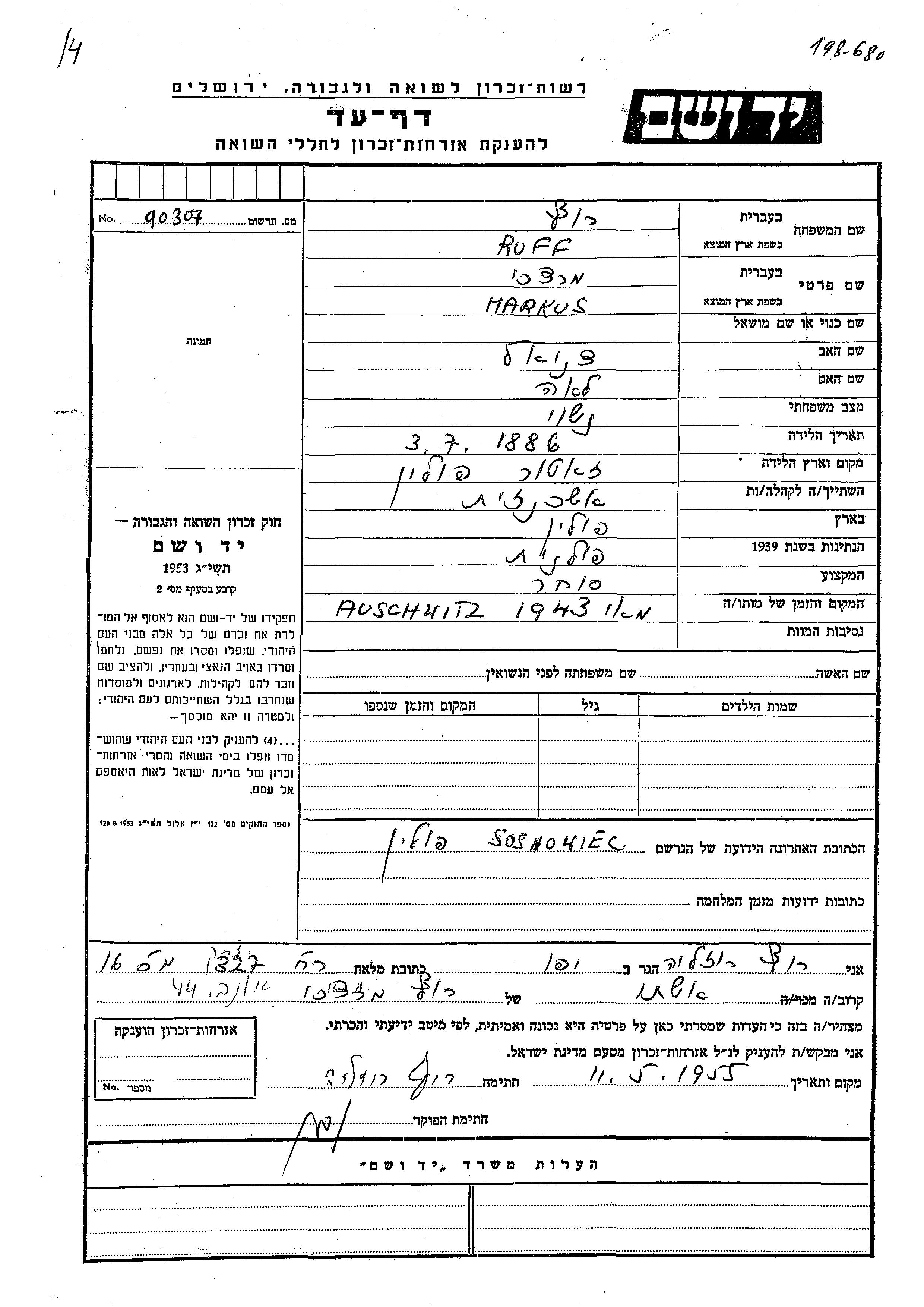 Mordekhai Markus Ruff was born in Zator, Poland, 1886 to Daniel and Lea. He was a merchant and married to Rozalia. Prior to WWII he lived in Sosnowiec, Poland. Mordekhai Markus was murdered in the Shoah. Place of death: Auschwitz, Poland, 05/1943.
