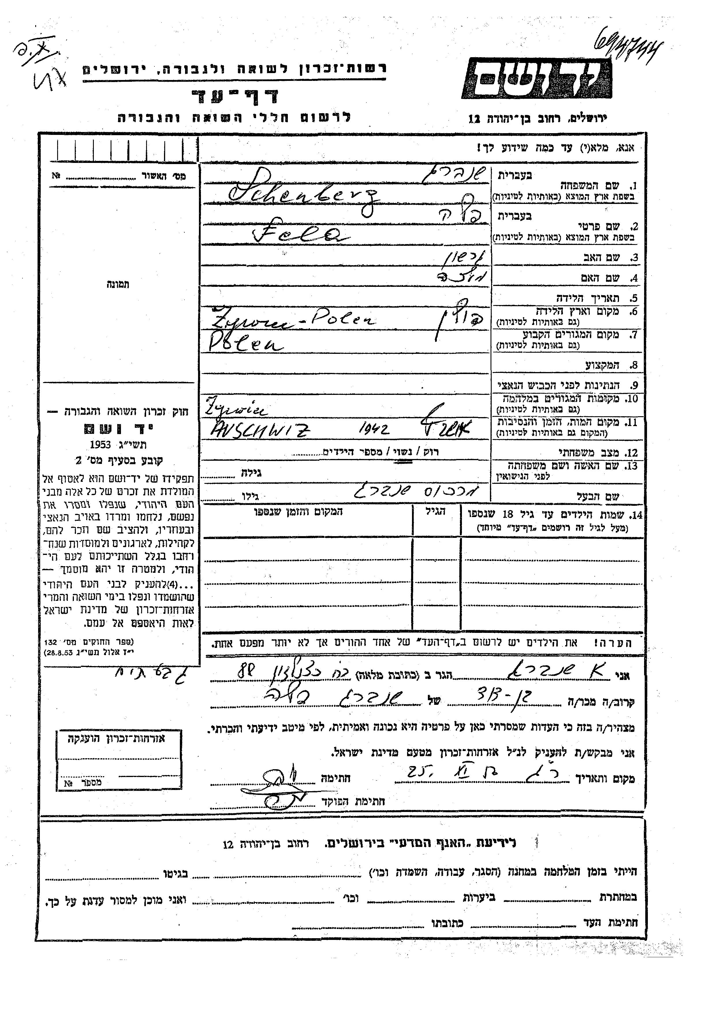 Fela Schenberg was born in Zywiec, Poland to Gershon and Malka. She was married to Markus. Prior to WWII she lived in Poland. During the war she was in Zywiec, Poland.