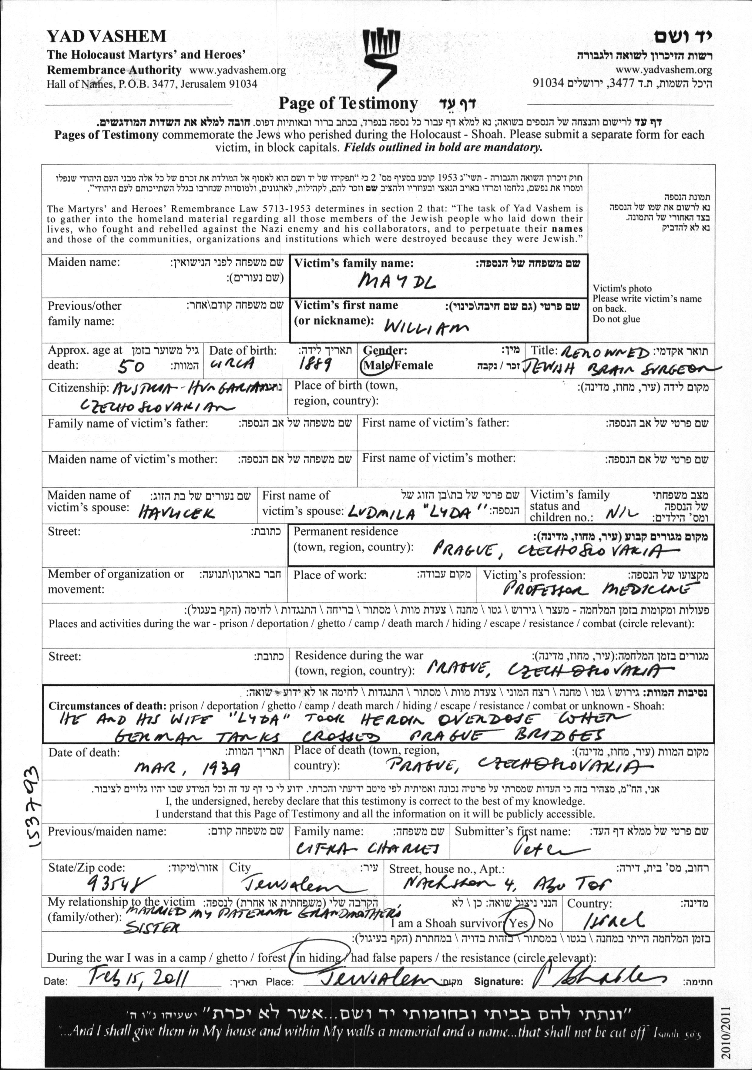 Maydl William 1889 Prague, Czechoslovakia Page of Testimony