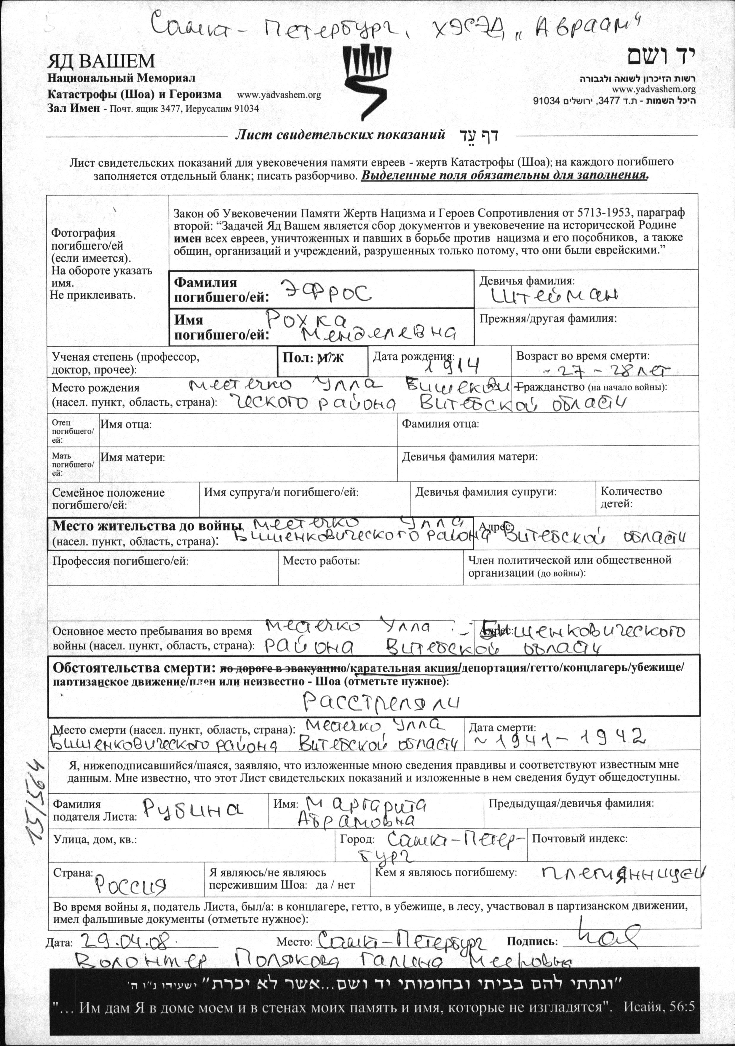 Efros Rokhka 1941 Ulla, Belorussia (USSR) Page of Testimony