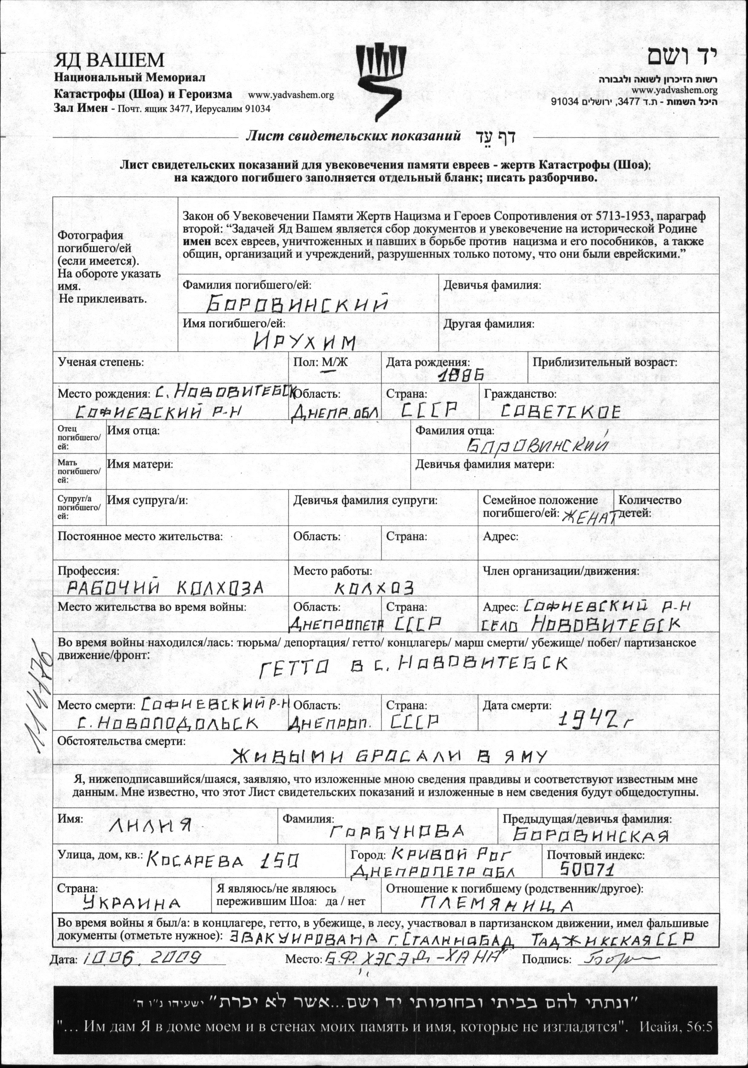 Borovinski Irukhim 1886 Novo Vitebsk, Ukraine (USSR) Page of Testimony