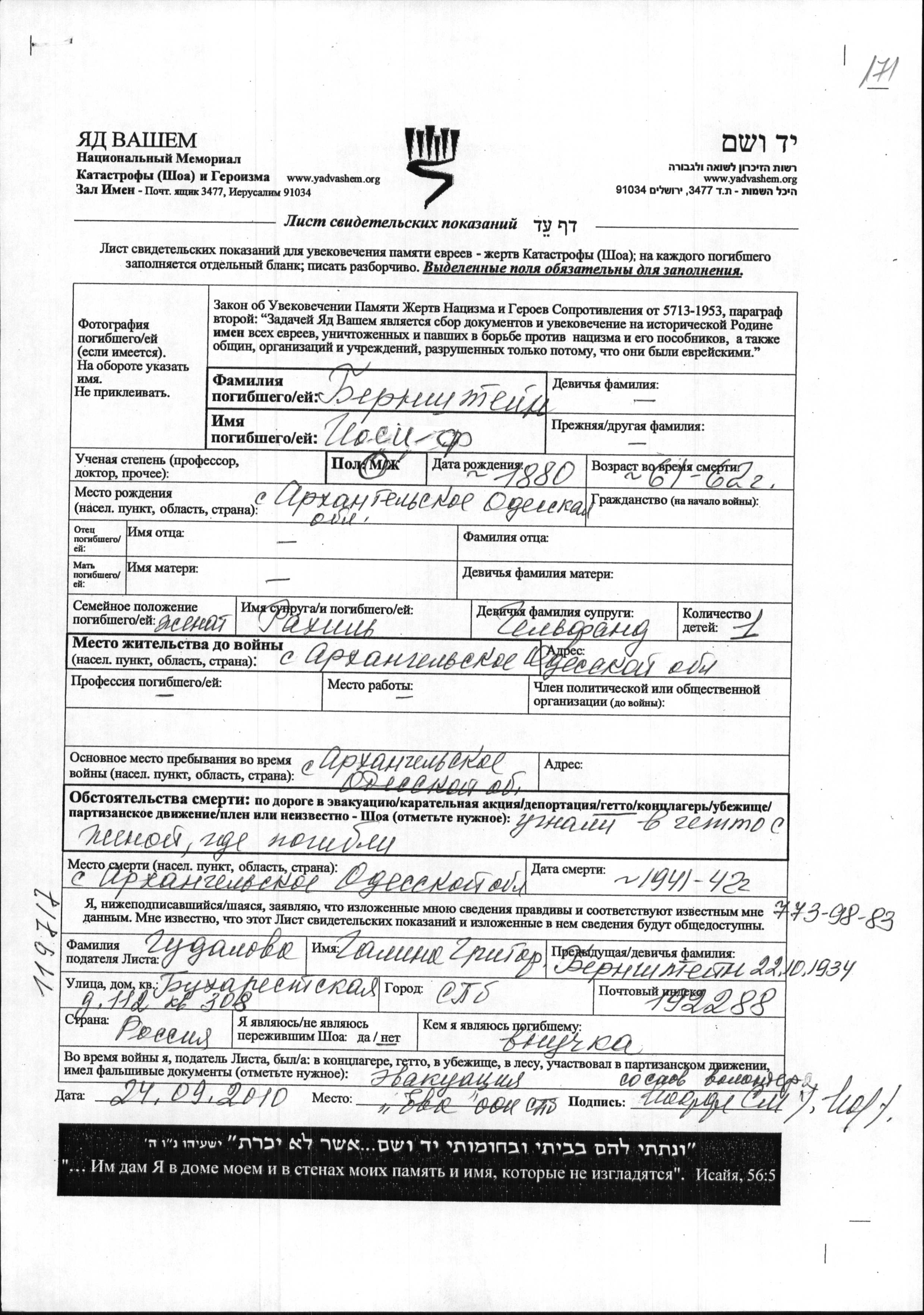 Bernshtein Iosif 1880 Arkhangelskoye, Ukraine (USSR) Page of Testimony