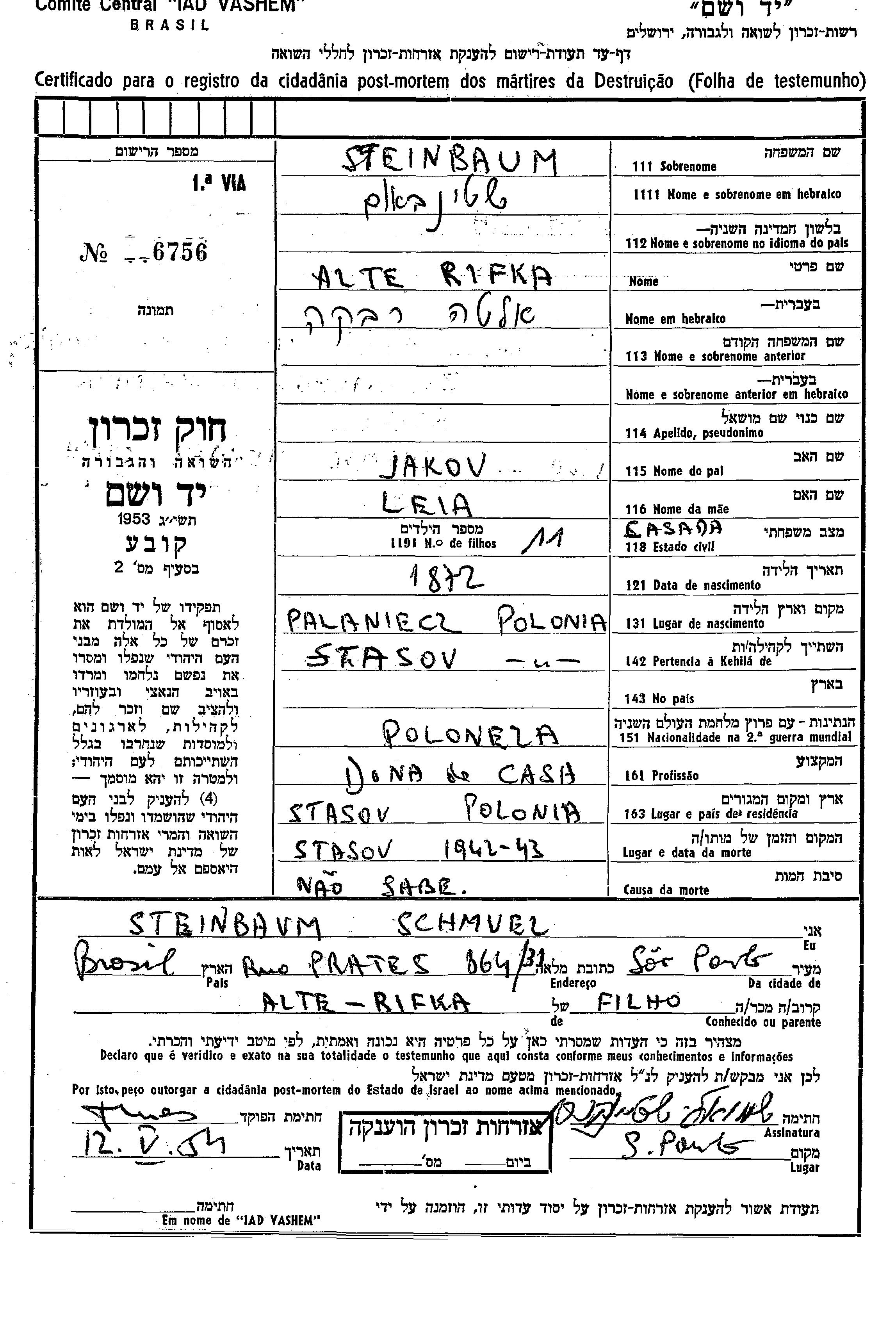 Rifka Alte Steinbaum was born in Polaniec, Poland, 1872 to Jakov and Leia. She was a housewife and married. Prior to WWII she lived in Staszow, Poland. During the war she was in Staszow, Poland. Rifka Alte was murdered in the Shoah. Place of death: Stasov, Poland, 1942.