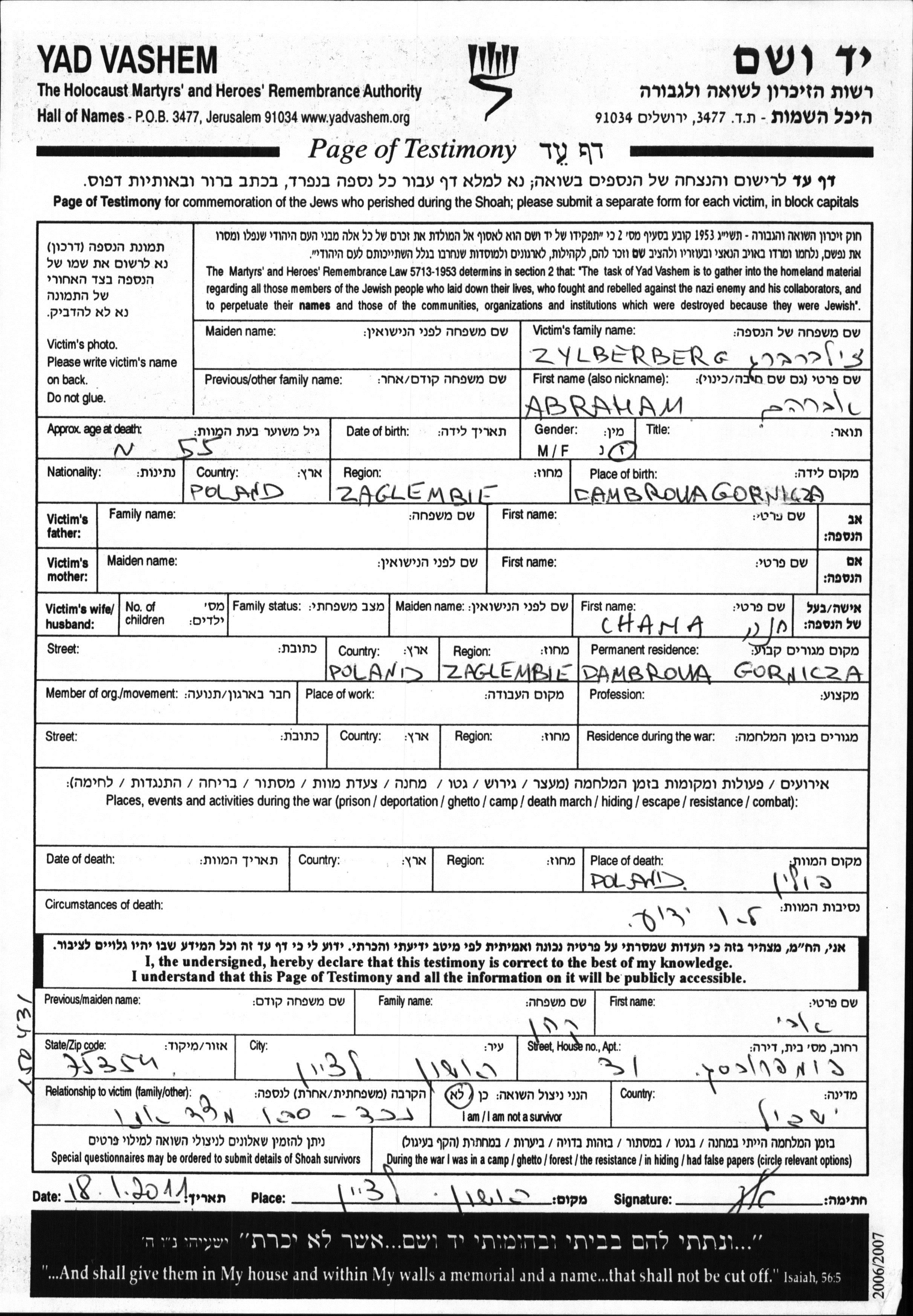 Abraham Zylberberg was born in Dabrowa Gornicza, Poland. He was married to Chana. Prior to WWII he lived in Dabrowa Gornicza, Poland. During the war he was in Poland. Abraham was murdered in the Shoah. Place of death: Poland.