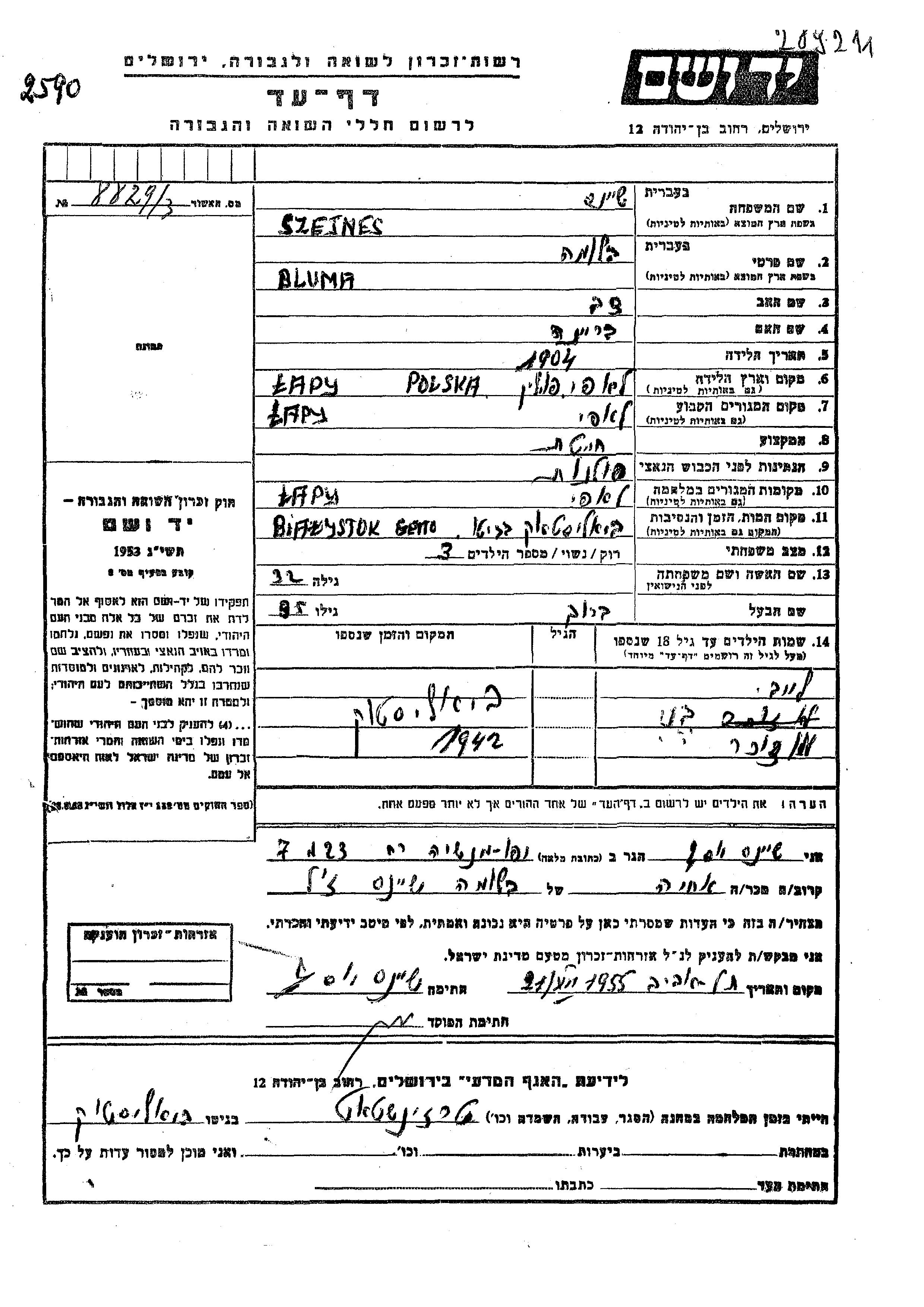 Bluma Szejnes was born in Łapy, Poland, 1904 to Dov and Breina. She was a seamstress and married to Barukh. Prior to WWII she lived in Łapy, Poland. During the war she was in Łapy, Poland. Bluma was murdered in the Shoah. Place of death: Bialystok, Poland.