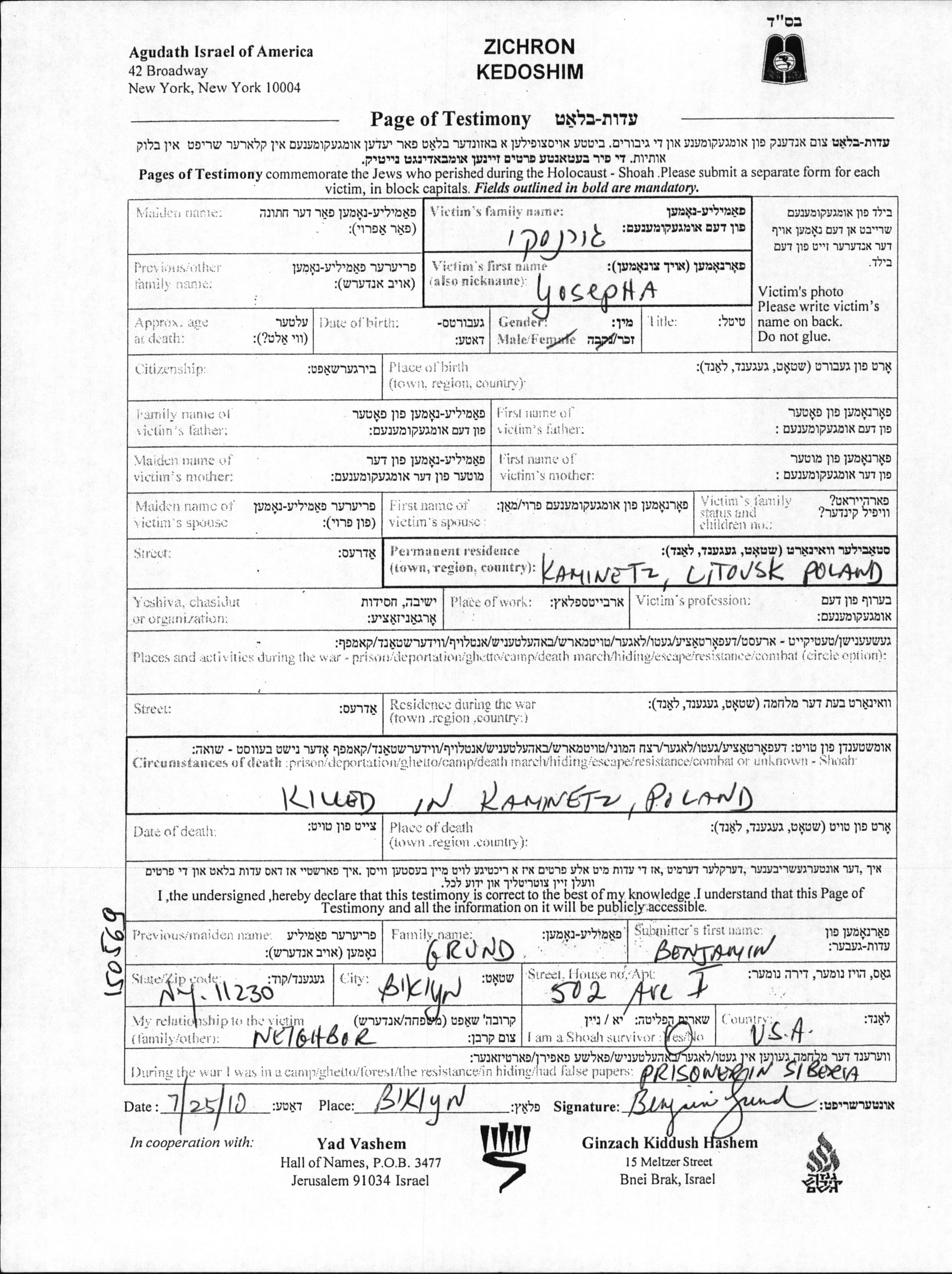 Gronski Yosepha Kamenez, Poland Page of Testimony