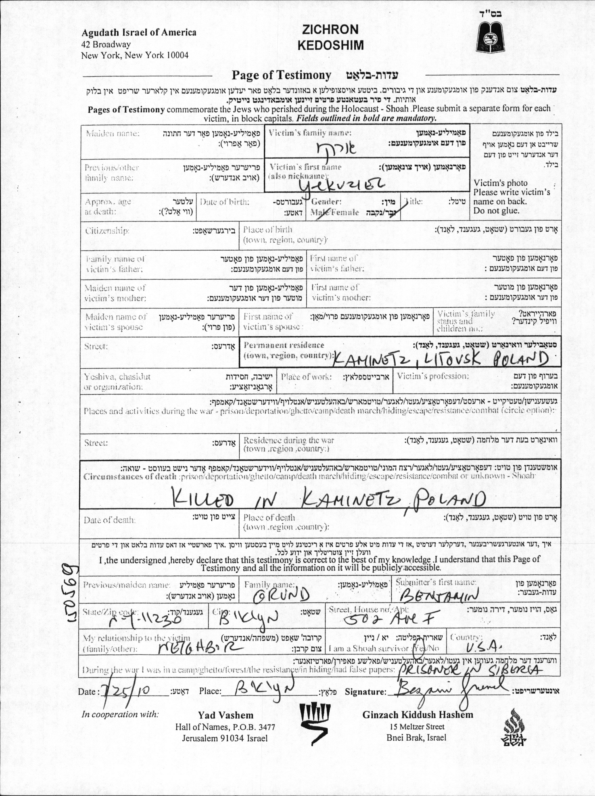 Gorki Yekuziel Kamenets Litovsk, Poland Page of Testimony