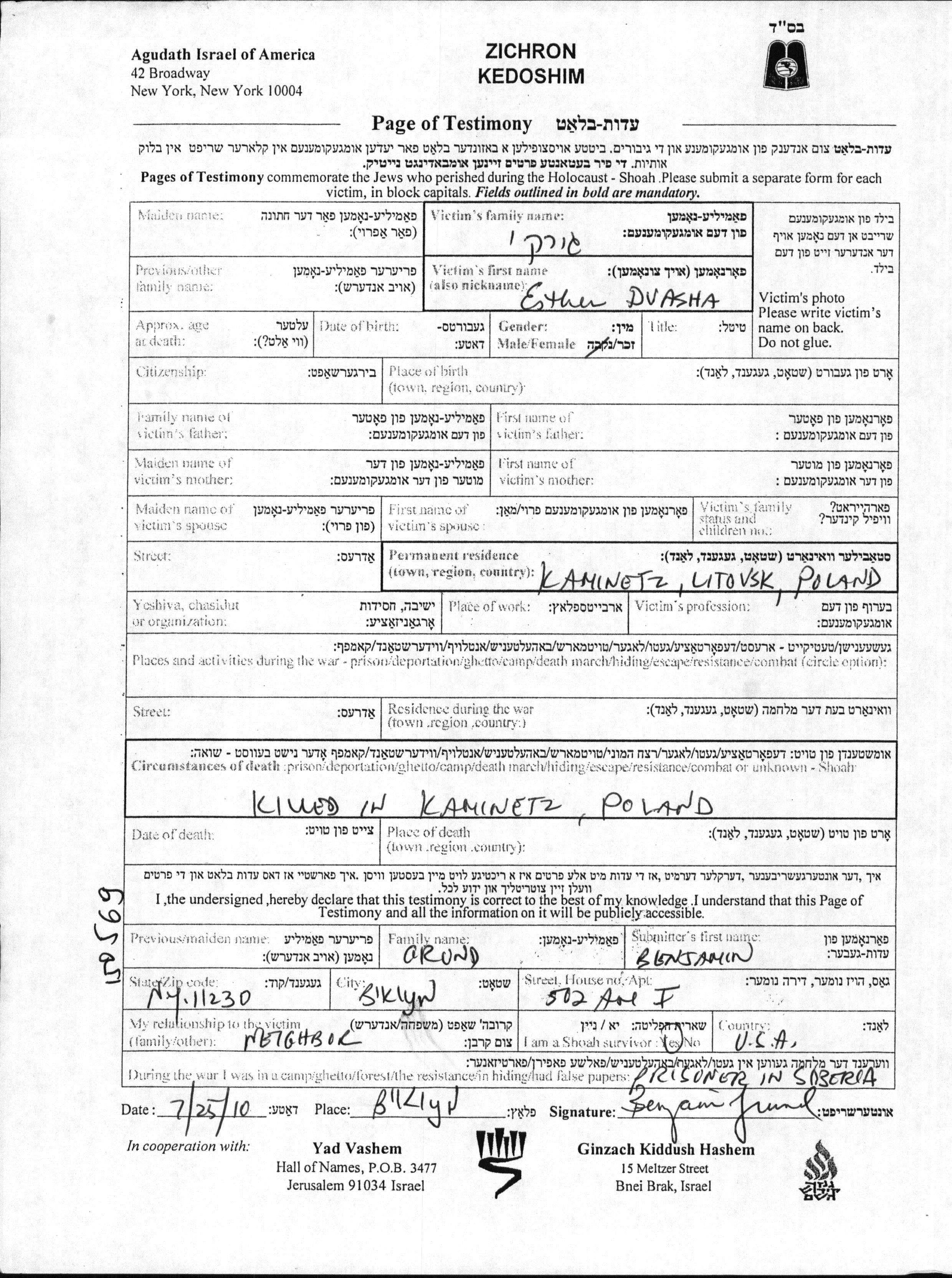 Gorki Esther Dvasha Kamenez, Poland Page of Testimony