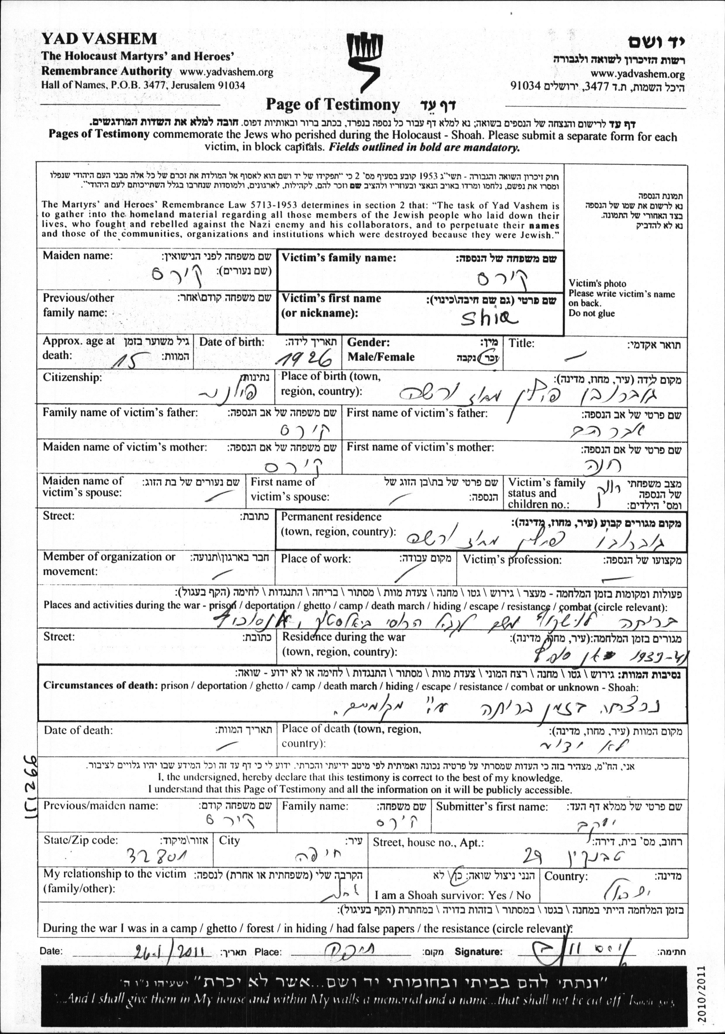 Shia Kires was born in Goworowo, Poland, 1926 to Avraham and Chana. He was single. Prior to WWII he lived in Goworowo, Poland. During the war he was in Hancewicze, Poland. Shia was murdered in the Shoah.