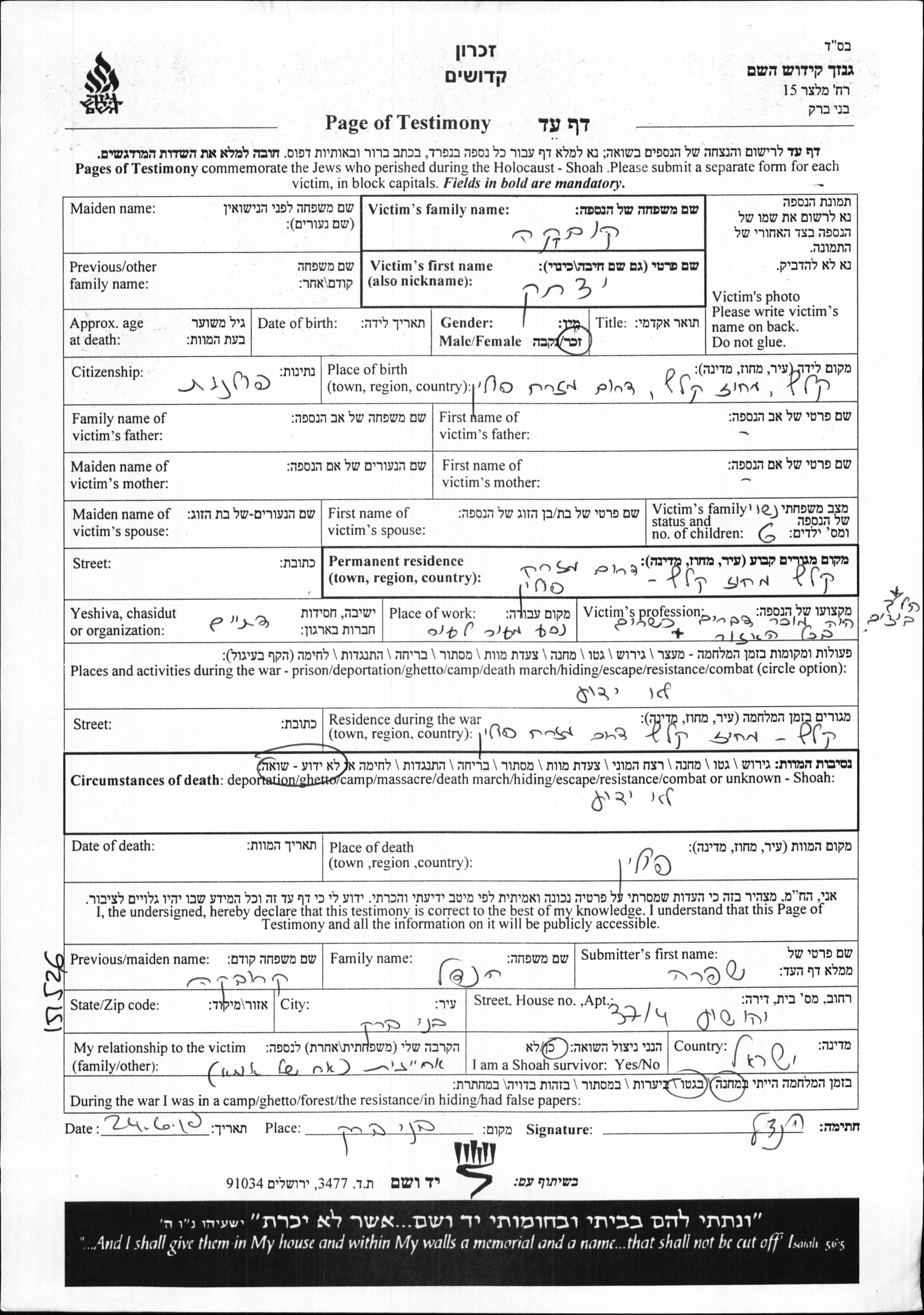 Kruvka Yitzkhak Kelce, Poland Page of Testimony