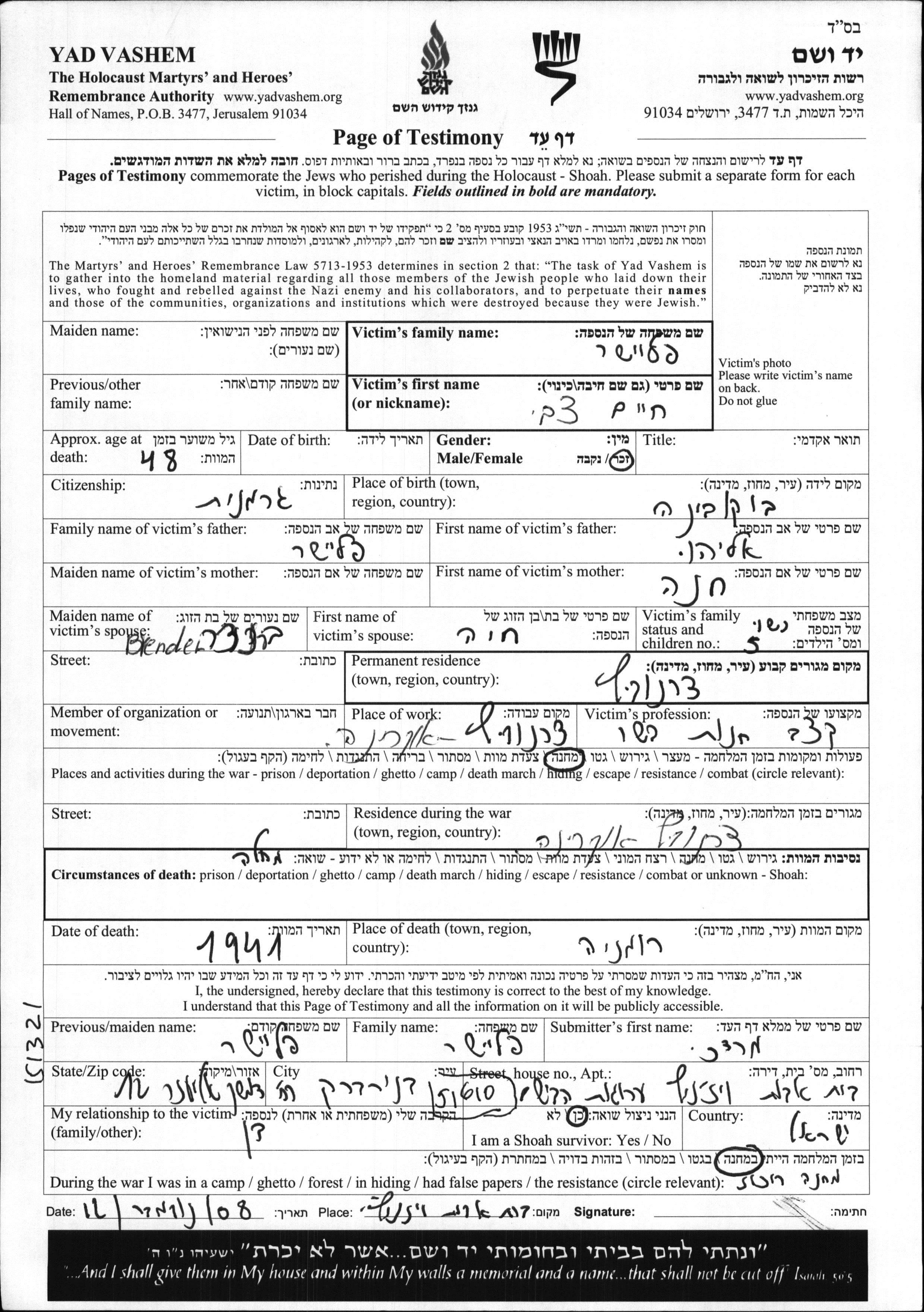 Khaim Tzvi Fleisher was born in Bukovina, Romania to Eliahu and Chana. He was a butcher and married to Chaia nee Brender. Prior to WWII he lived in Chernovitz, Romania. During the war he was in Chernovitz, Romania. Khaim Tzvi was murdered in the Shoah. Place of death: Romania, 1941.