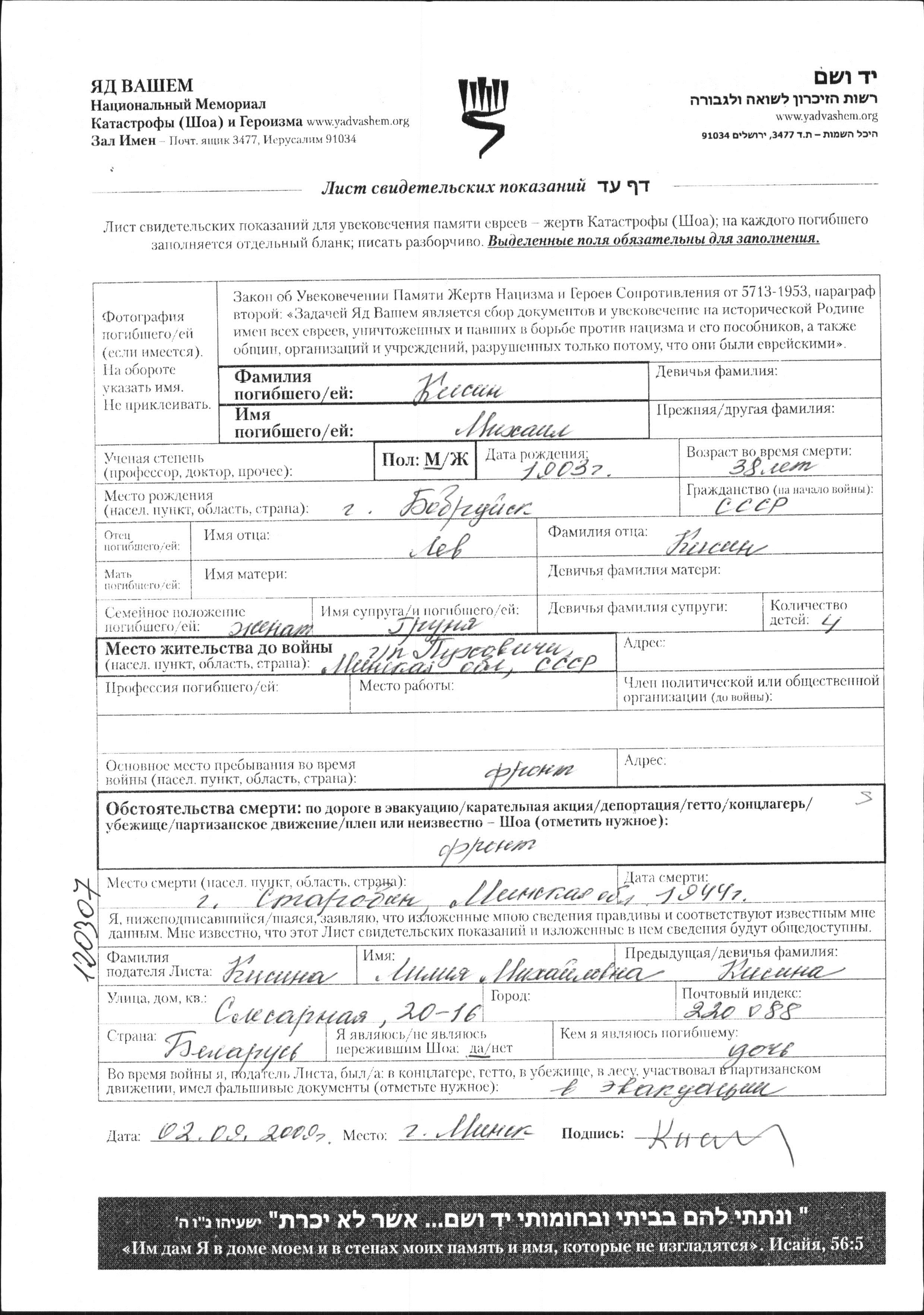 Mikhail Kisin was born in Bobruysk, Belorussia (USSR), 1903 to Lev. He was married to Grunya. Prior to WWII he lived in Pukhovichi, Belorussia (USSR). During the war he was in the Soviet armed forces. Mikhail was killed in military service in WWII. Place of death: Starobin, Belorussia (USSR), 1941.