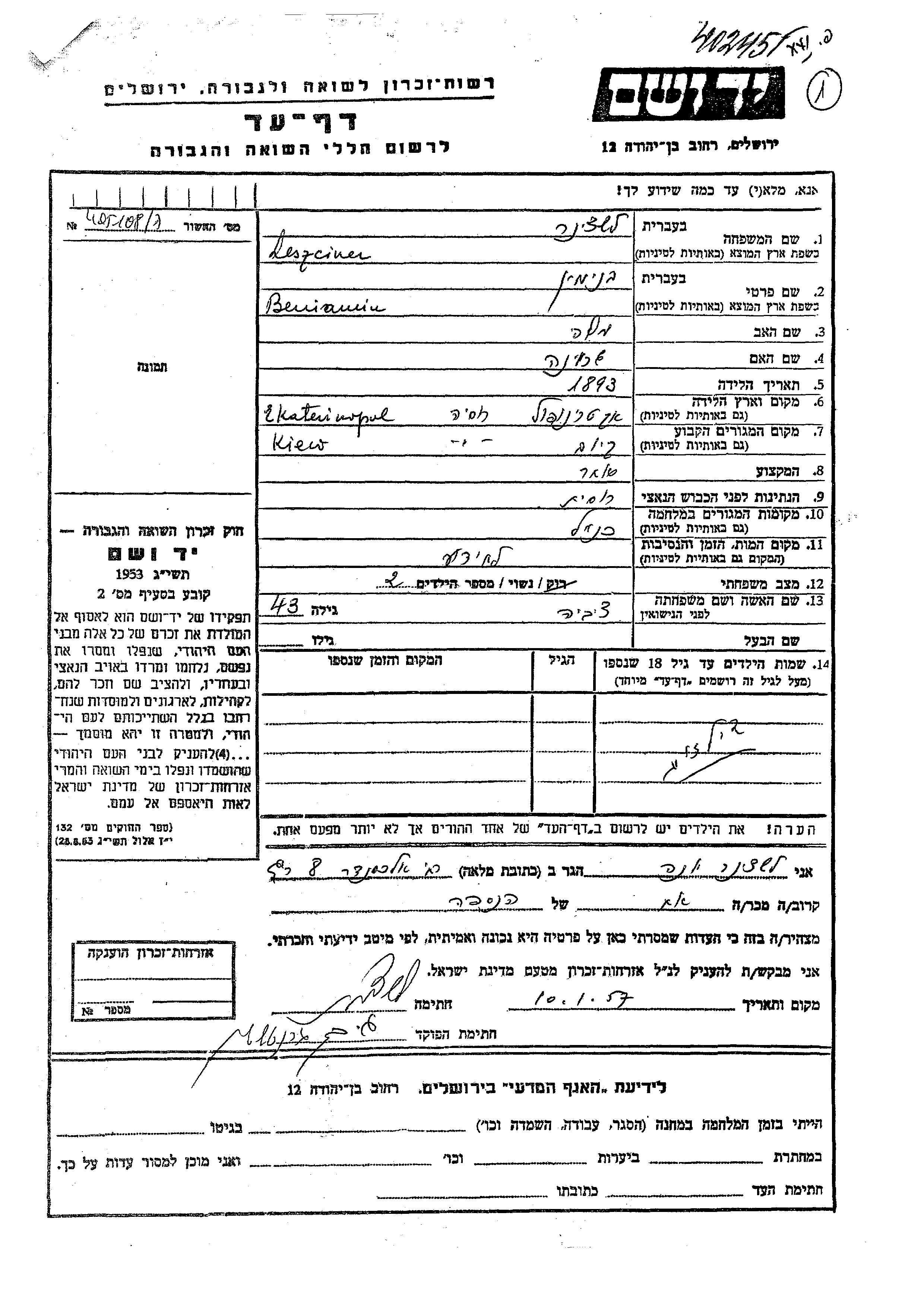 Beniamin Leszciner was born in Yekaterinopol, Ukraine (USSR), 1893 to Moshe and Groina. He was a merchant and married to Tzivia. Prior to WWII he lived in Kiew, Ukraine (USSR). During the war he was in Kiew, Ukraine (USSR).