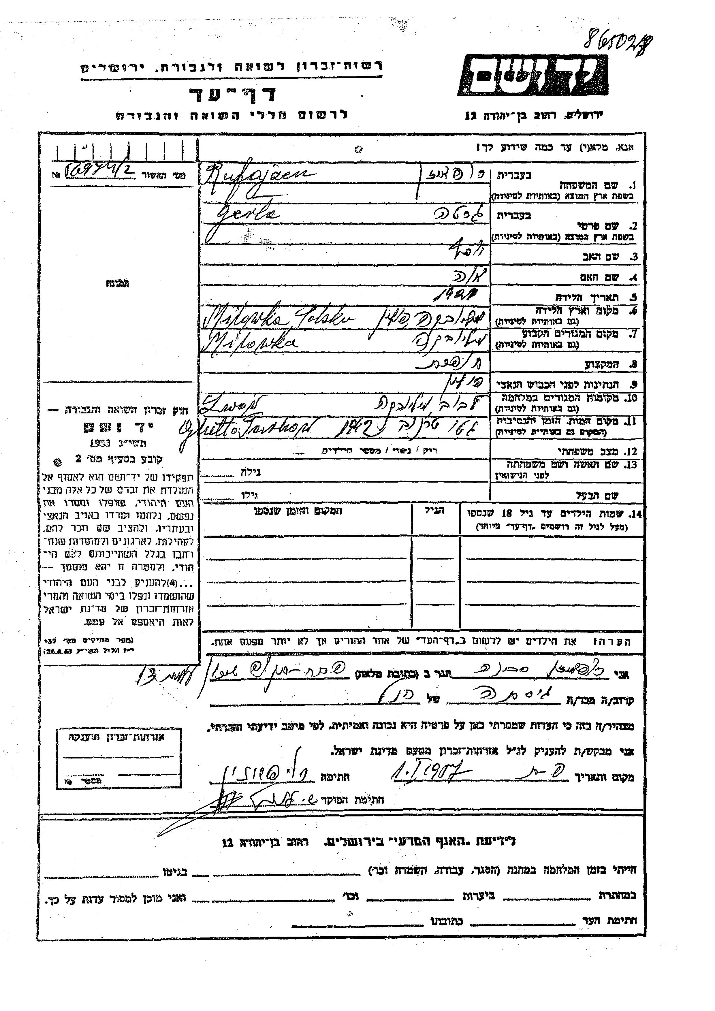 Greta Rufajzen was born in Milowka, Poland, 1921 to Yosef and Eva. She was a seamstress. Prior to WWII she lived in Milowka, Poland. During the war she was in Lwow, Poland. Greta was murdered in the Shoah. Place of death: Tarnow, Poland, 1942.