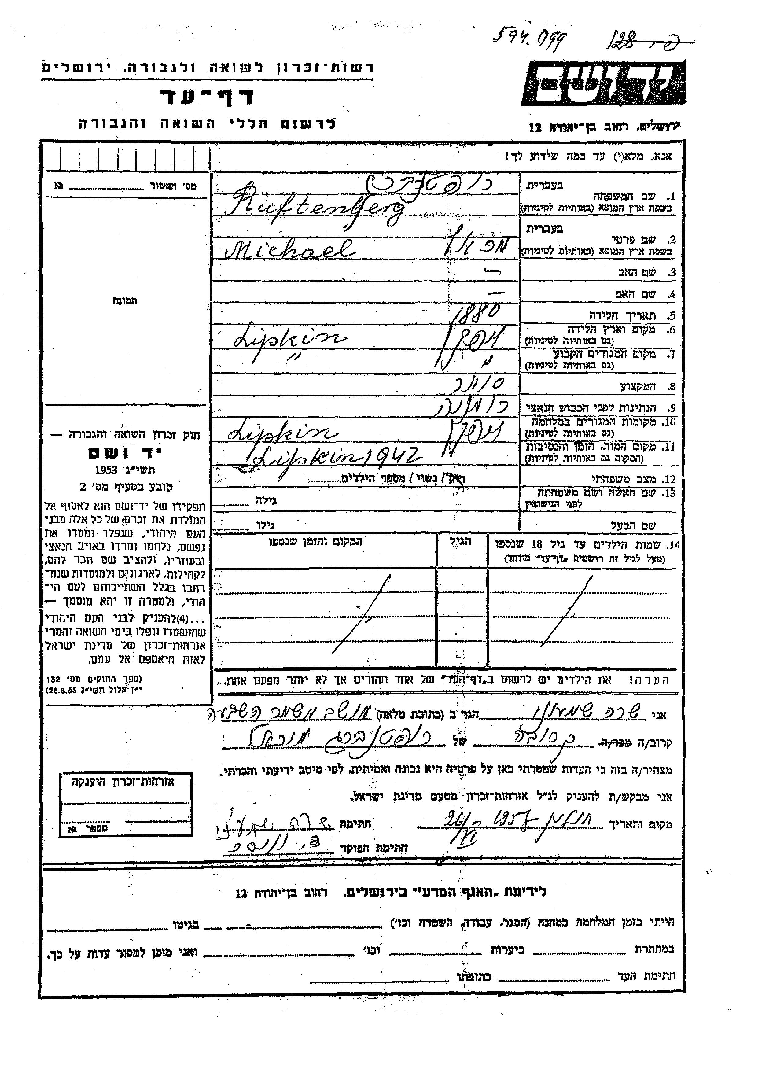 Michael Ruftenberg was born in Lipkin, Romania, 1880. He was a merchant and married. Prior to WWII he lived in Lipkin, Romania. During the war he was in Lipkin, Romania. Michael was murdered in the Shoah. Place of death: Lipkin, Romania, 1942.