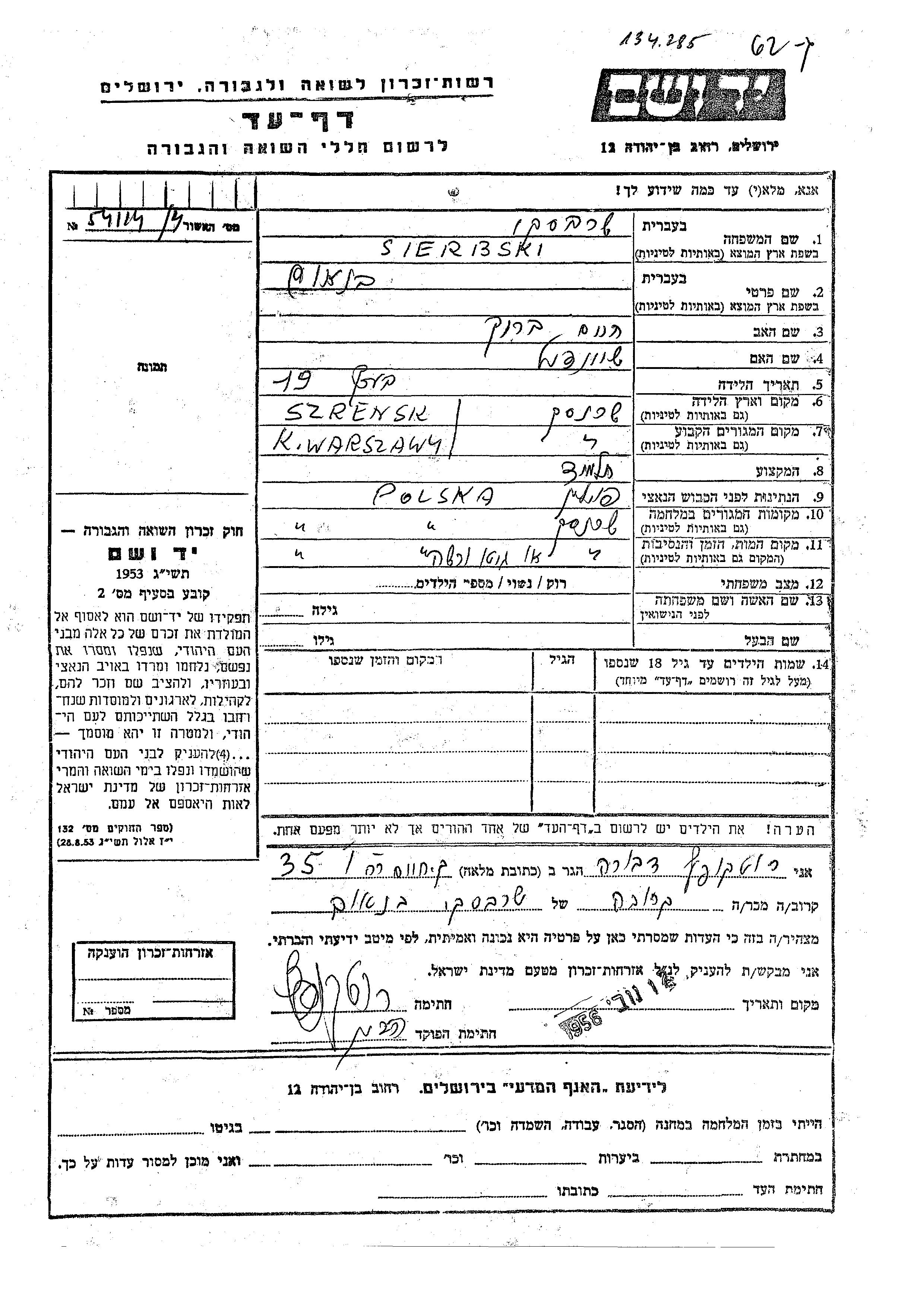 Benum Sierbski was born in Szrensk, Poland to Khaim Barukh and Sheindil. He was a pupil. Prior to WWII he lived in Szrensk, Poland. During the war he was in Szrensk, Poland. Benum was murdered in the Shoah. Place of death: Szrensk, Poland.