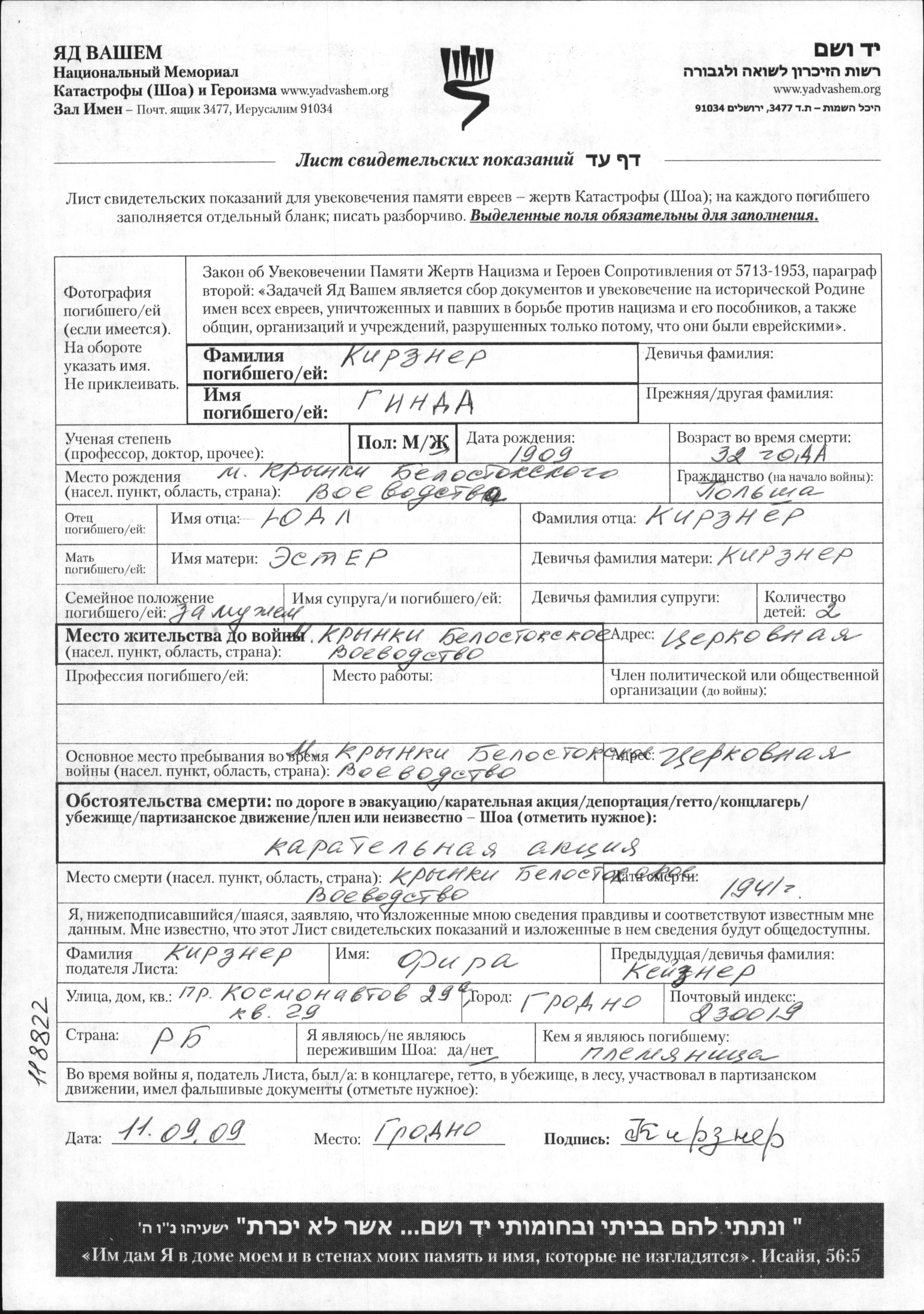 Ginda Kirzner was born in Krynki, Poland, 1909 to Yudl and Ester. She was married. Prior to WWII she lived in Krynki, Poland. During the war she was in Krynki, Poland. Ginda was murdered in the Shoah. Place of death: Krynki, Poland, 1941.