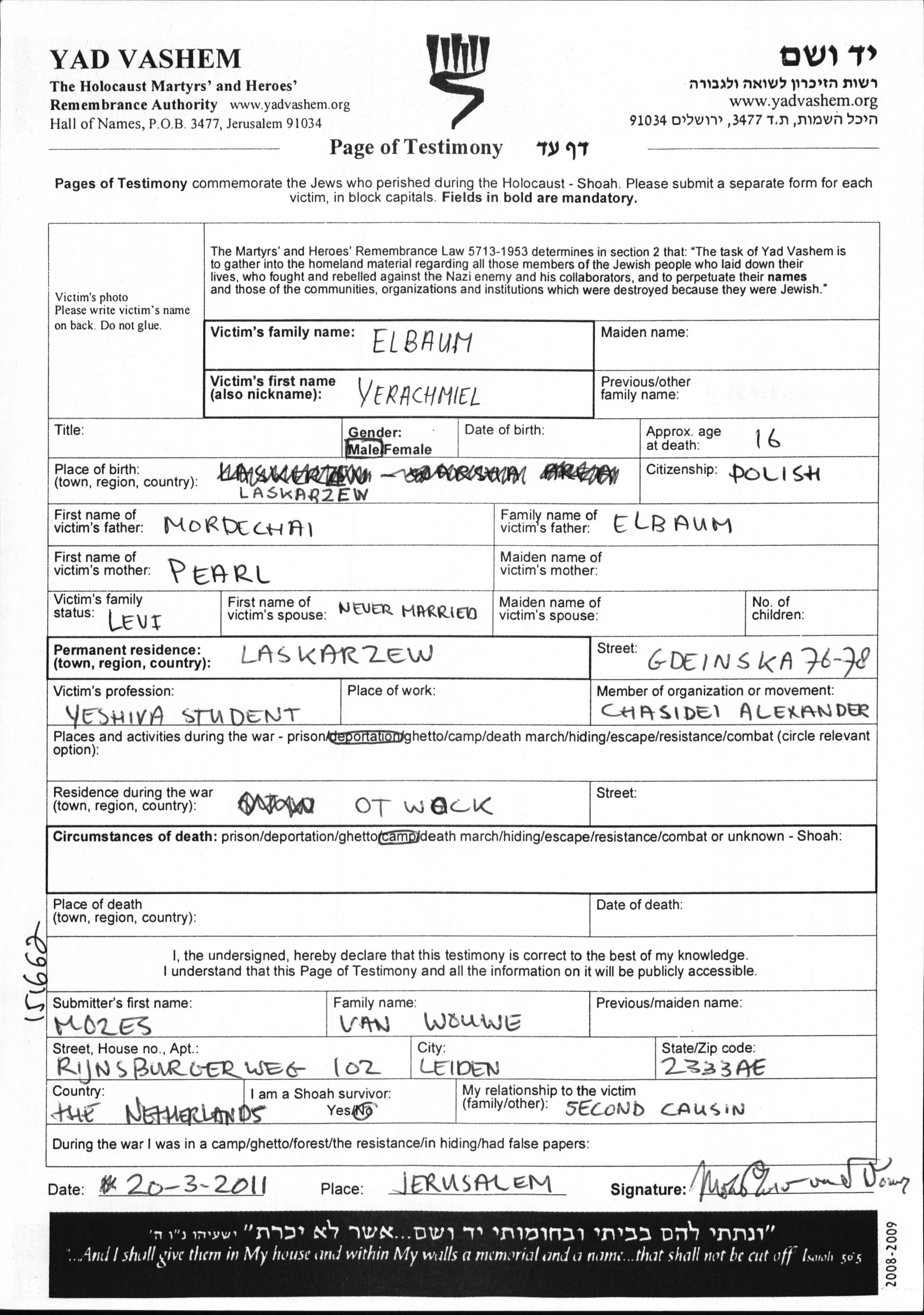Yerachmiel Elbaum was born in Laskarzew, Poland to Mordechai and Pearl. He was a yeshiva student and teenager. Prior to WWII he lived in Laskarzew, Poland. During the war he was in Otwock, Poland. Yerachmiel was murdered in the Shoah.