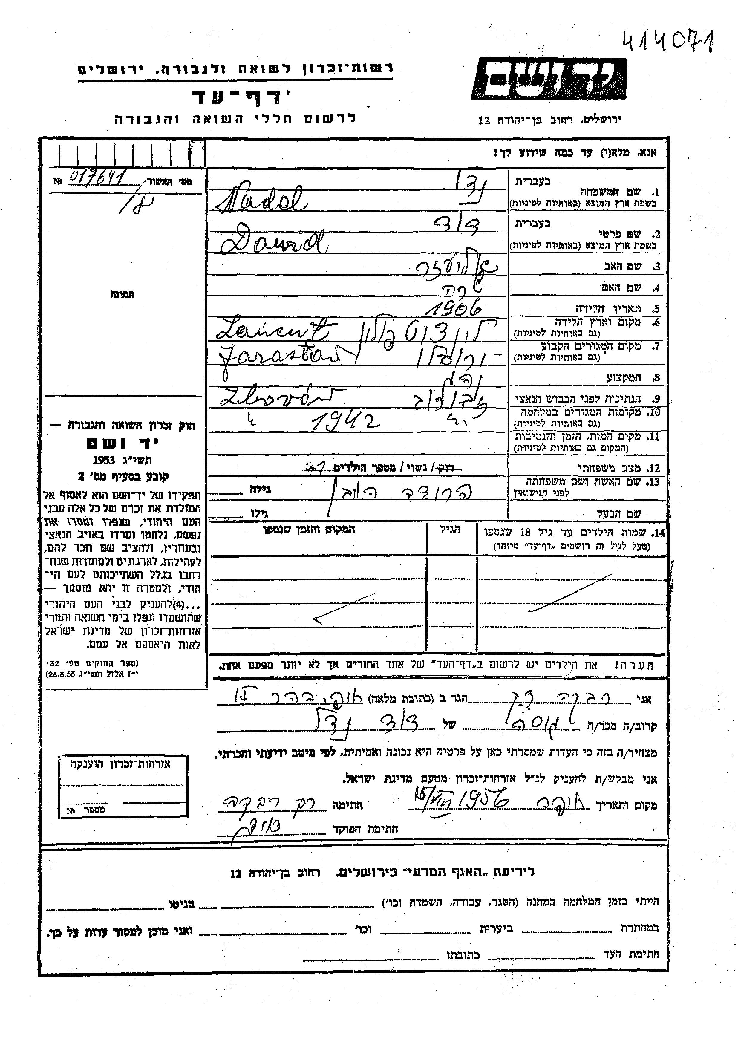 Dawid Nadel was born in Lancut, Poland, 1906 to Eliezer and Sara. He was a driver and married to Frida nee Hoiben. Prior to WWII he lived in Jaroslaw, Poland. During the war he was in Zborow, Poland. Dawid was murdered in the Shoah. Place of death: Zborow, Poland, 1942.