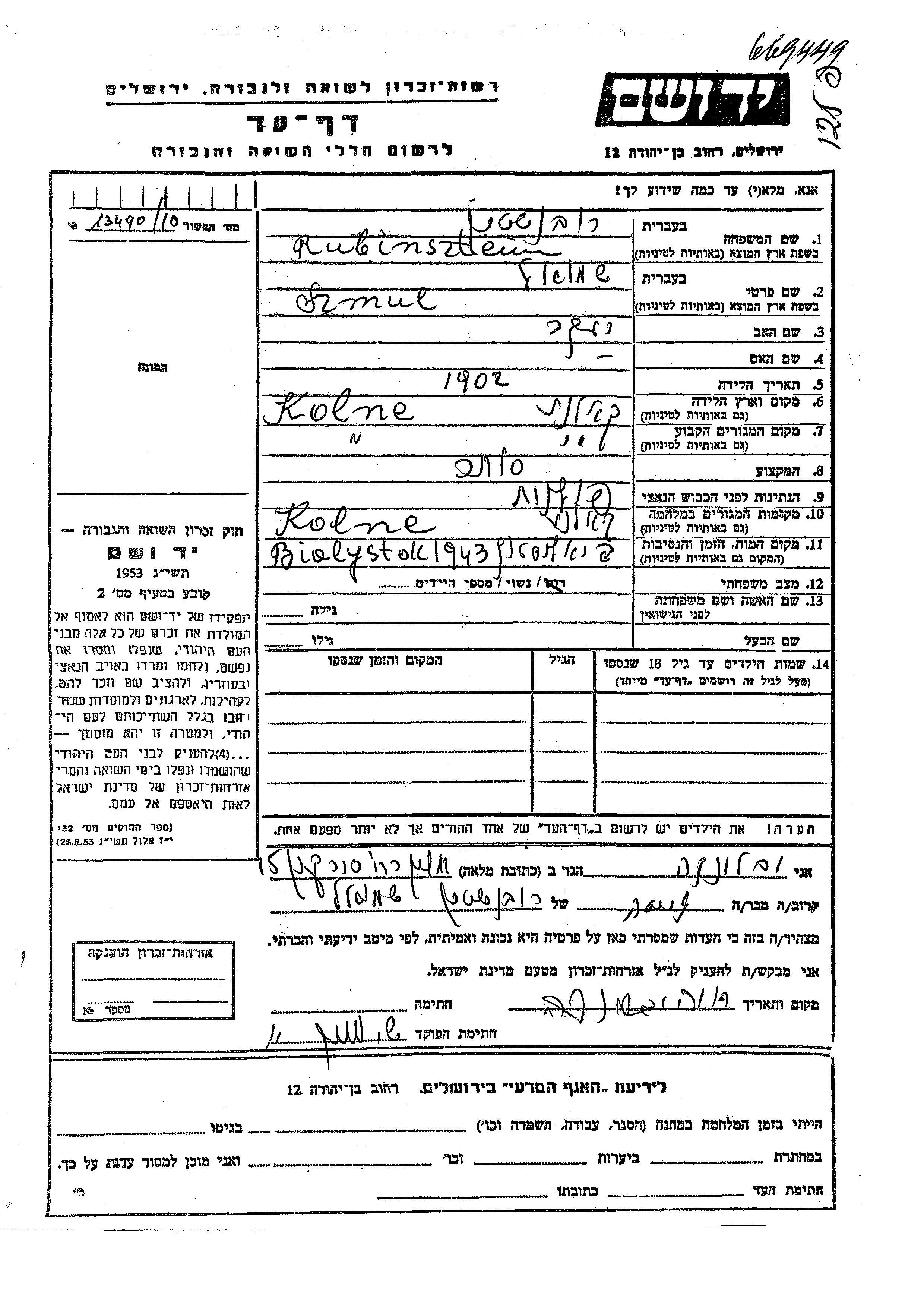 Szmul Rubinsztein was born in Kolne, Poland, 1902 to Yaakov. He was a merchant and married. Prior to WWII he lived in Kolne, Poland. During the war he was in Kolne, Poland. Szmul was murdered in the Shoah. Place of death: Bialystok, Poland, 1943.