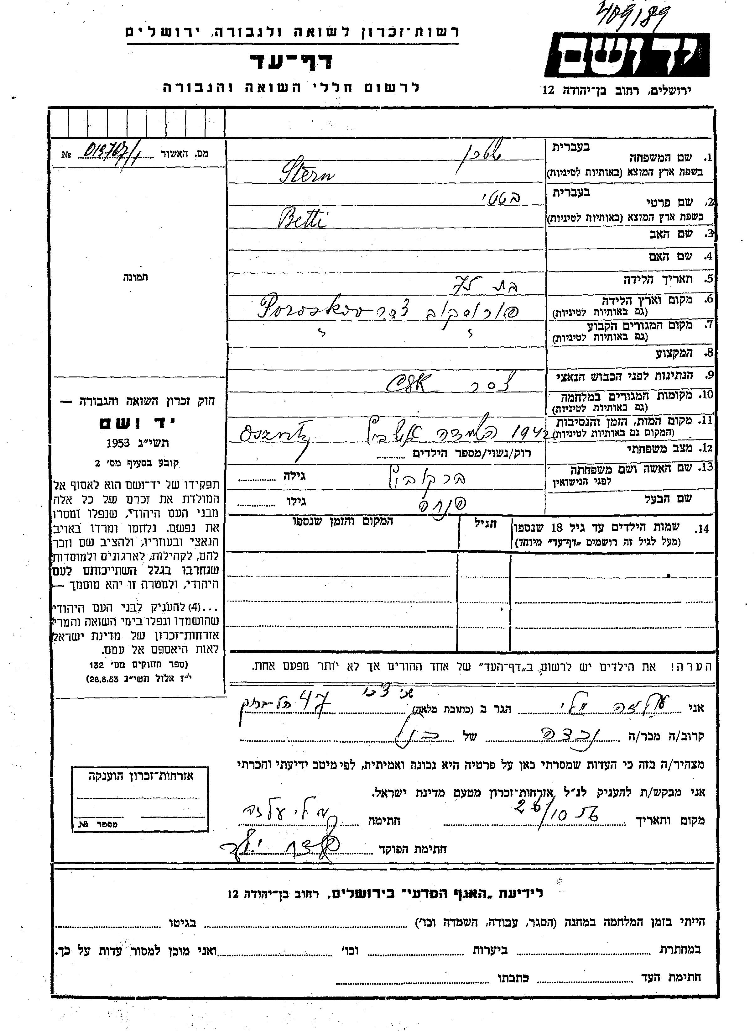 Stern Betti Betsi Poroskov, Czechoslovakia Page of Testimony