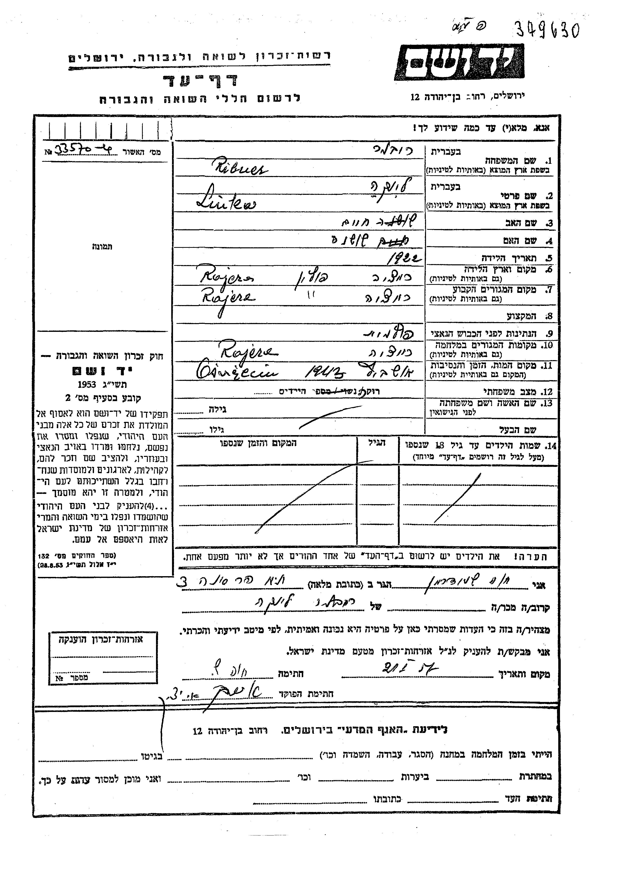 Liuka Ribner was born in Rajcza, Poland, 1922 to Khaim and Shoshana. She was single. Prior to WWII she lived in Rajcza, Poland. During the war she was in Rajcza, Poland. Liuka was murdered in the Shoah. Place of death: Auschwitz, Poland, 1943.