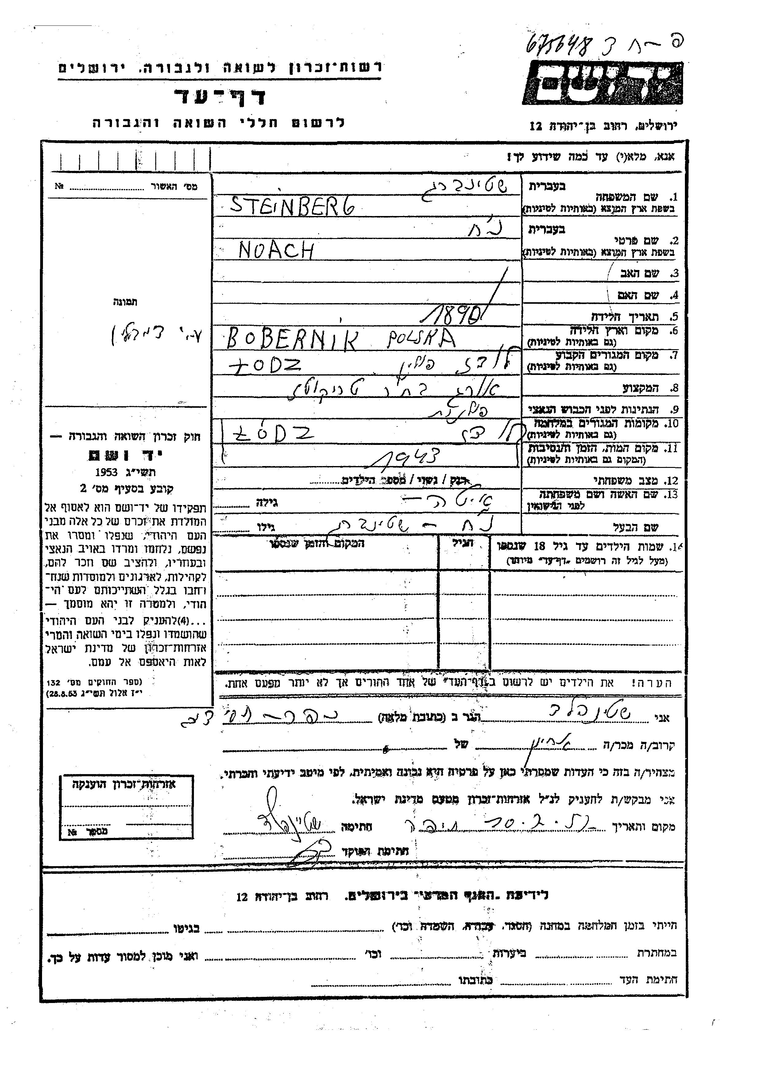 Noach Steinberg was born in Bobernik, Poland, 1890. He was a אורג בבית חרושת and married to Ita. Prior to WWII he lived in Lodz, Poland. During the war he was in Lodz, Poland. Noach was murdered in the Shoah. Place of death: Lodz, Poland, 1943.