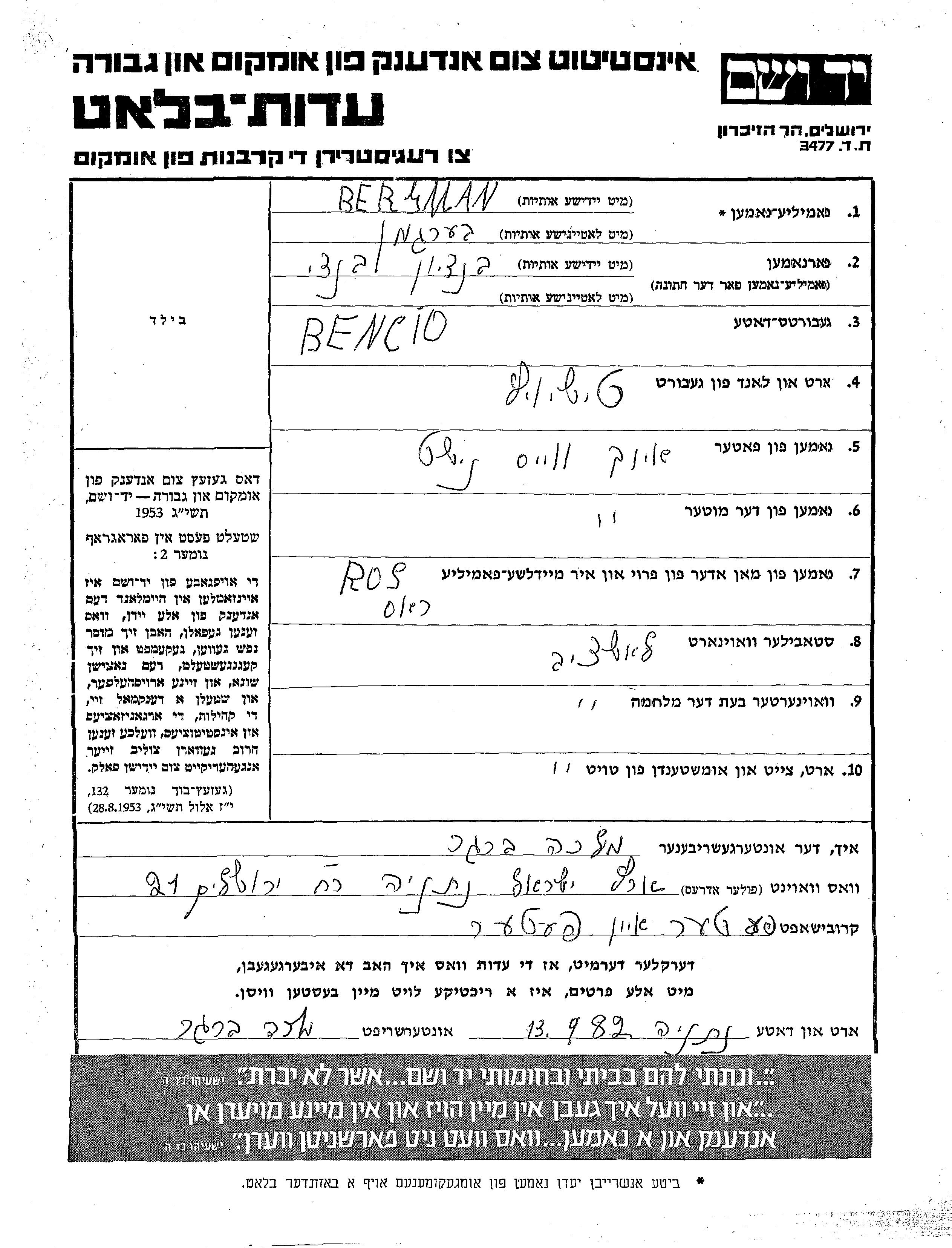 Bencio Bergman was born in Tyszowic, Poland. Prior to WWII he lived in Laszczow, Poland. During the war he was in Laszczow, Poland.
