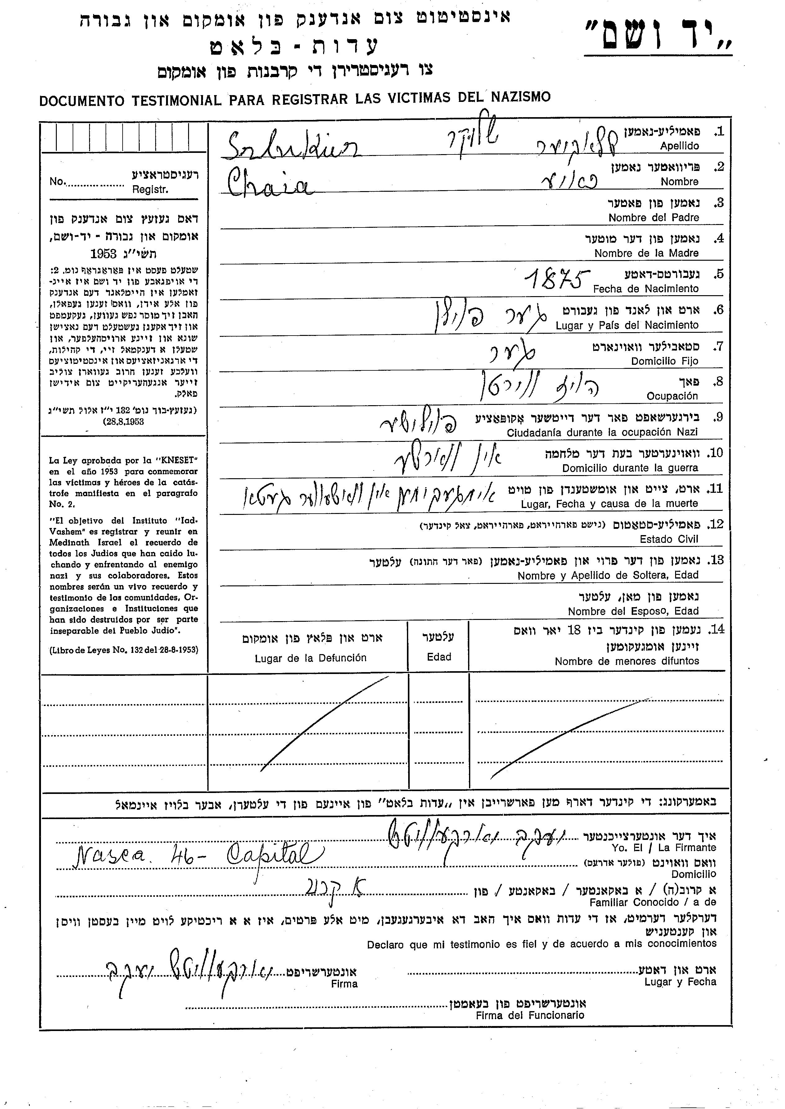 Chaia Szlukier was born in Gora Kalwaria, Poland, 1875. She was a housewife. Prior to WWII she lived in Gora Kalwaria, Poland. During the war she was in Warsaw, Poland. Chaia was murdered in the Shoah. Place of death: Warsaw, Poland.
