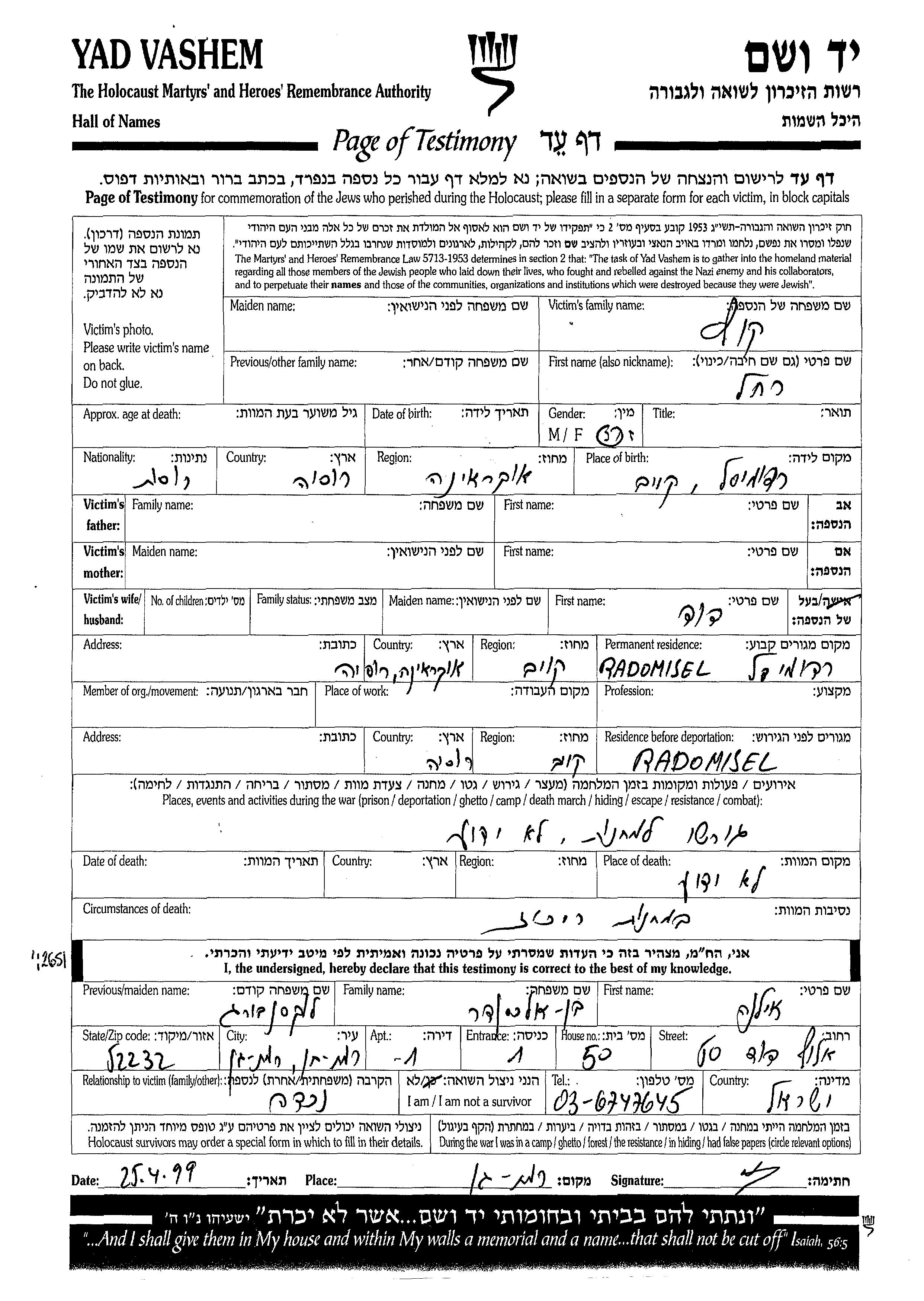 Yad Vashem - Pages of Testimony Names Memorial Collection