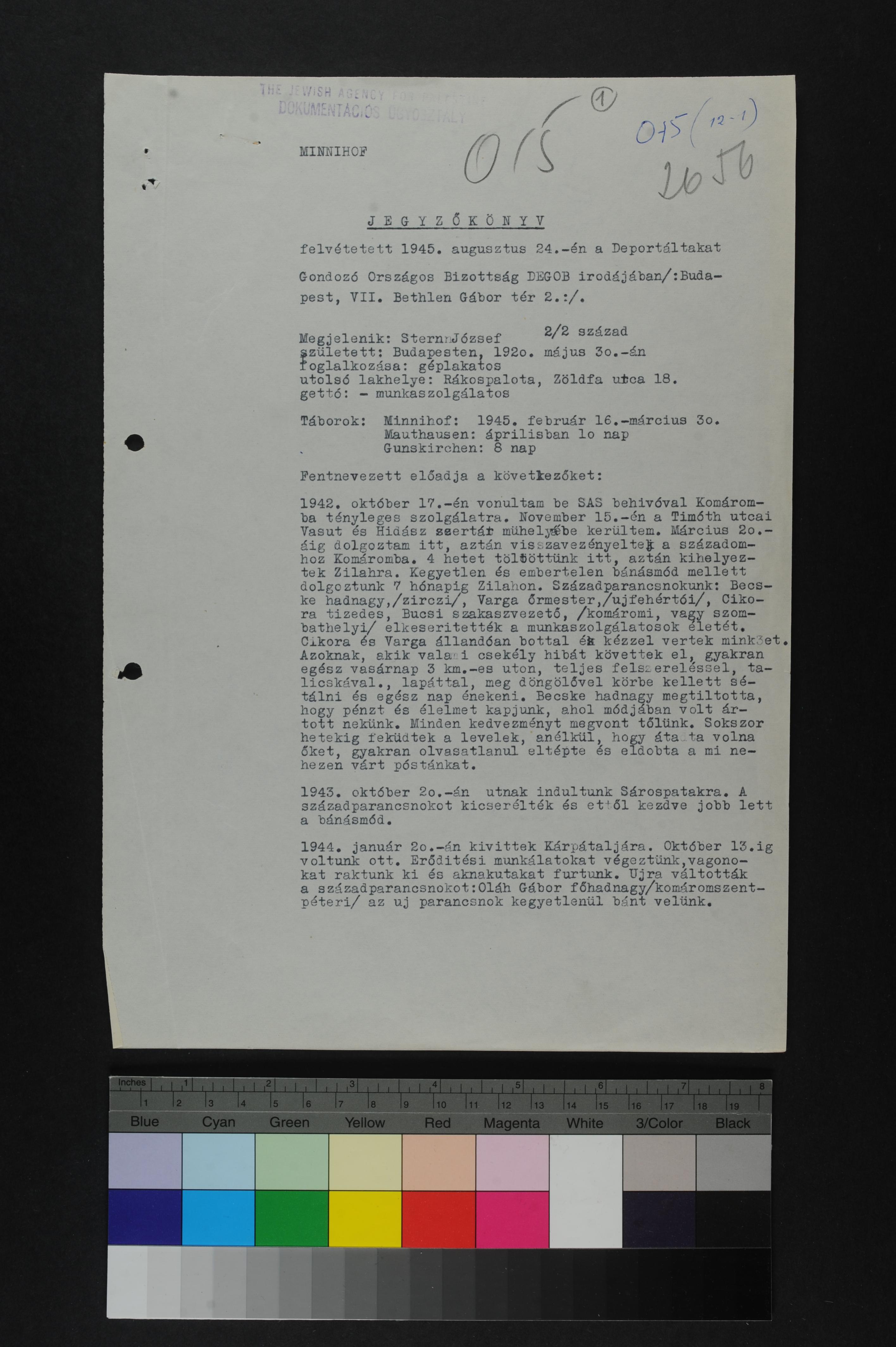 József Stern was born in Budapest, Hungary, 1920. He was a machine locksmith. Prior to WWII he lived in Rakospalota, Hungary. During the war he was in Gunskirchen, Austria. József survived the Shoah.