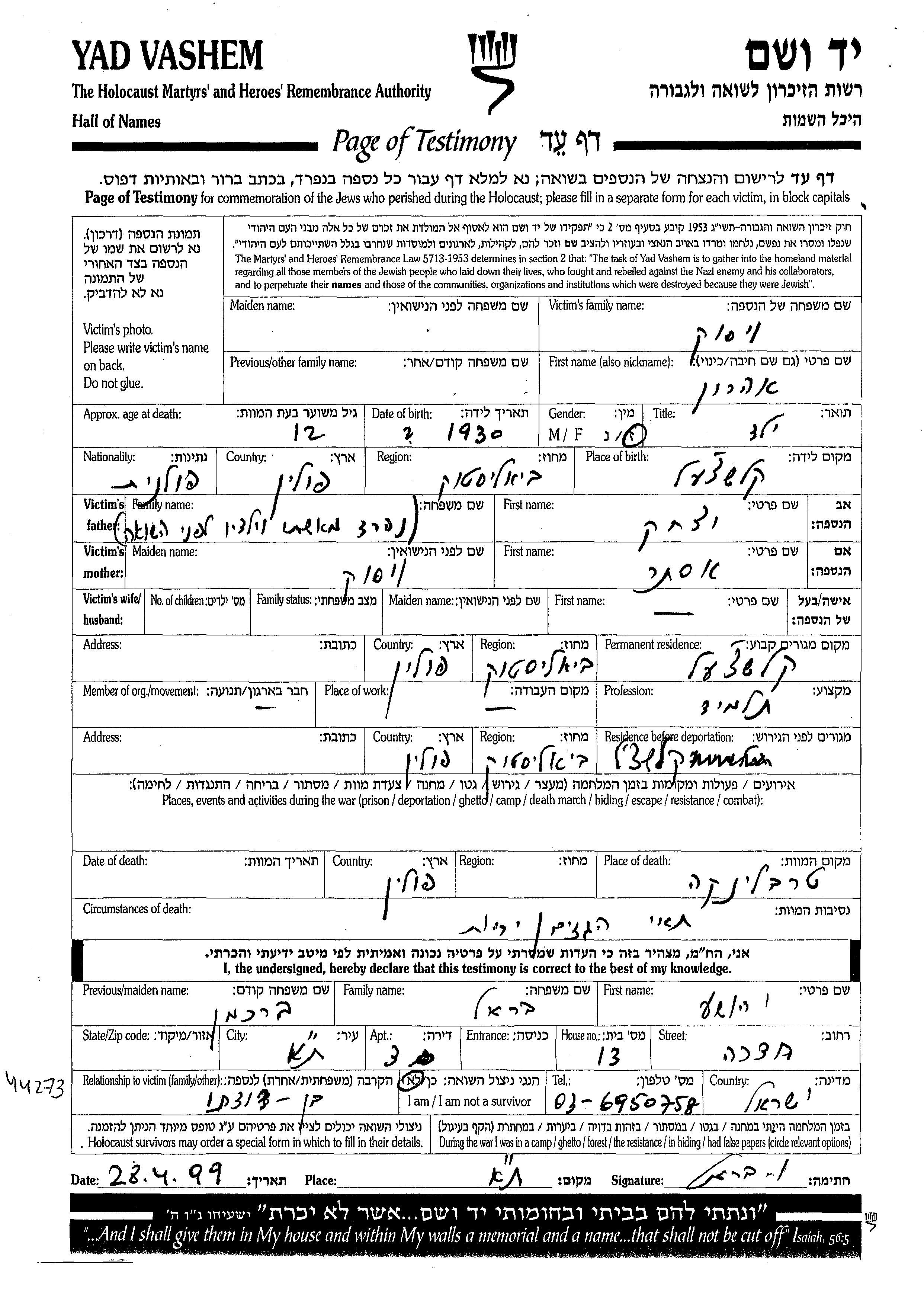 Aharon Visok was born in Kleszczele, Poland, 1930 to Yitzkhak and Ester. He was a pupil and child. Prior to WWII he lived in Kleszczele, Poland. During the war he was in Kleszczele, Poland. Aharon was murdered in the Shoah. Place of death: Treblinka, Poland.