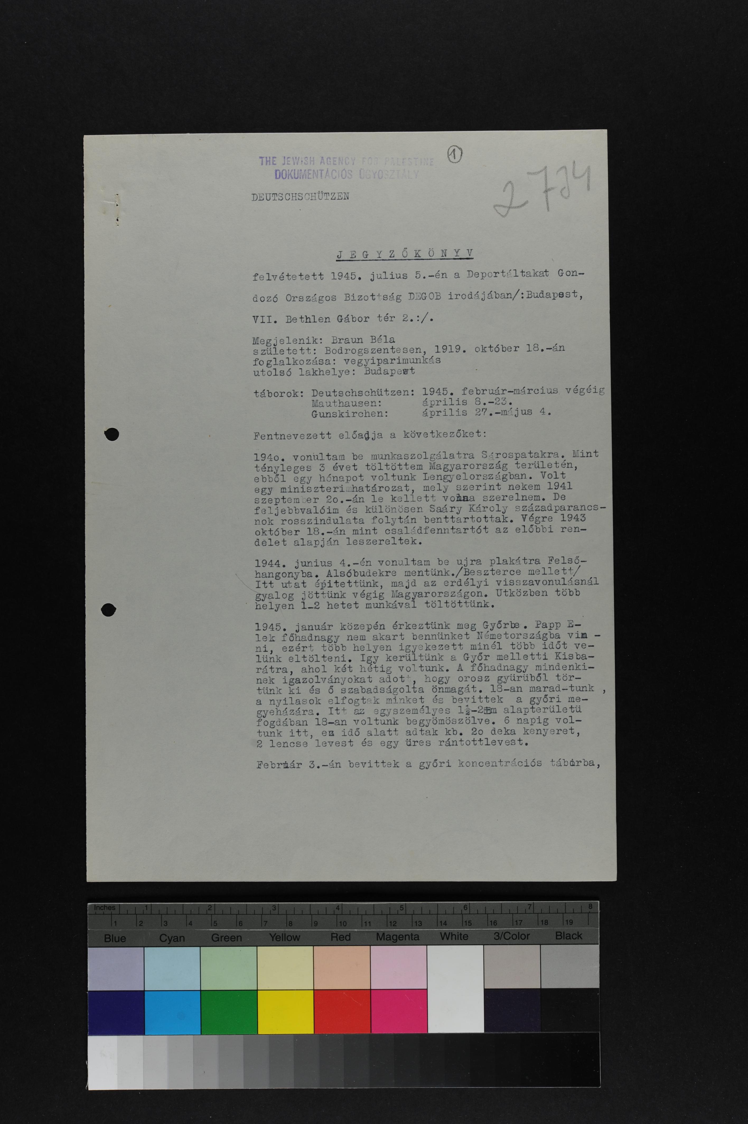 Béla Braun was born in Bodrogszentes, Czechoslovakia, 1919. He was a vegyipari munkás. Prior to WWII he lived in Budapest, Hungary. During the war he was in Deutsch Schuetzen, Austria. Béla survived the Shoah.