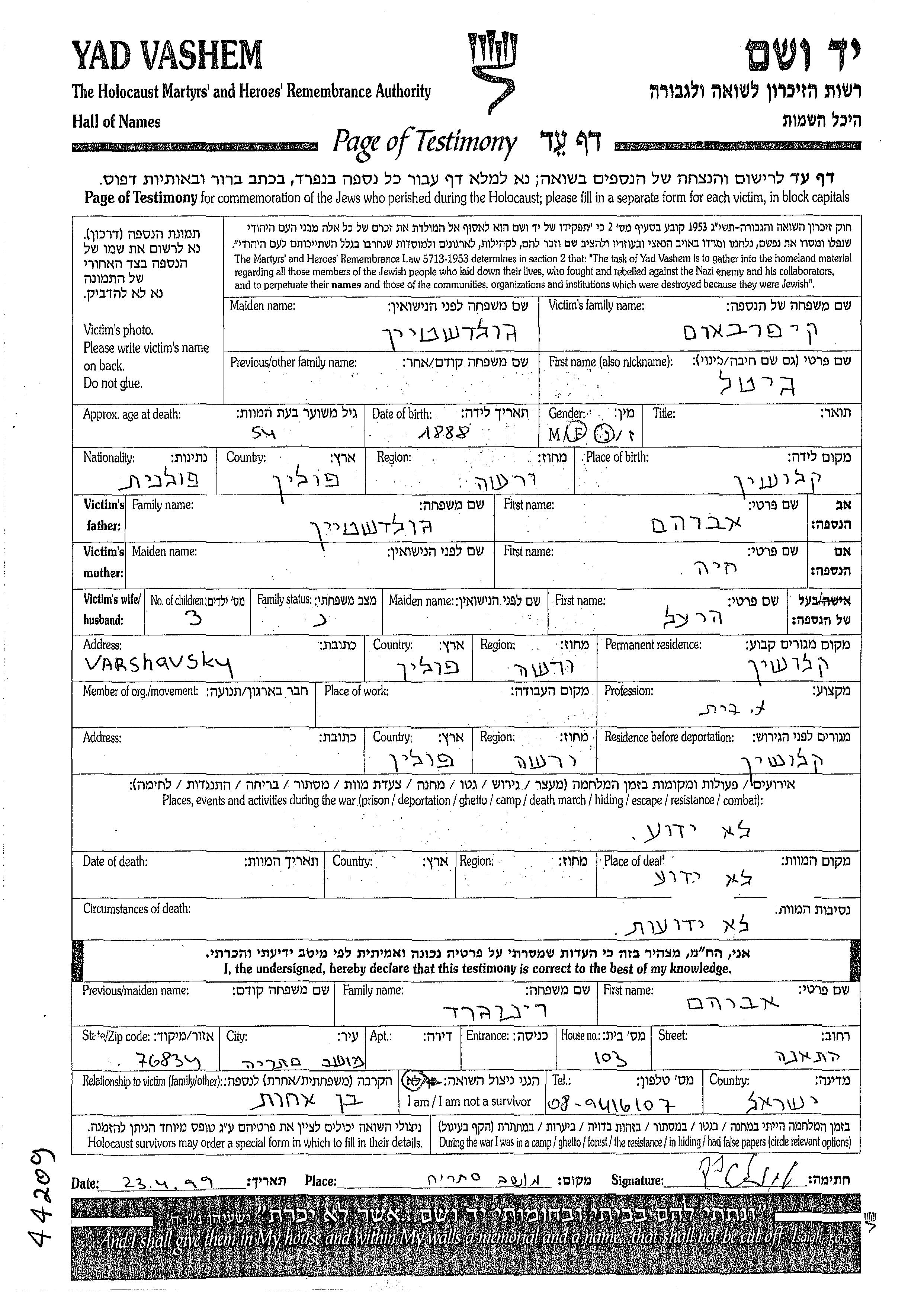 Gitel Kiperbaum nee Goldshtein was born in Kloszyn, Poland, 1888 to Avraham and Khaia. She was a housewife and married to Herel. Prior to WWII she lived in Kloszyn, Poland. During the war she was in Kloszyn, Poland. Gitel was murdered in the Shoah.