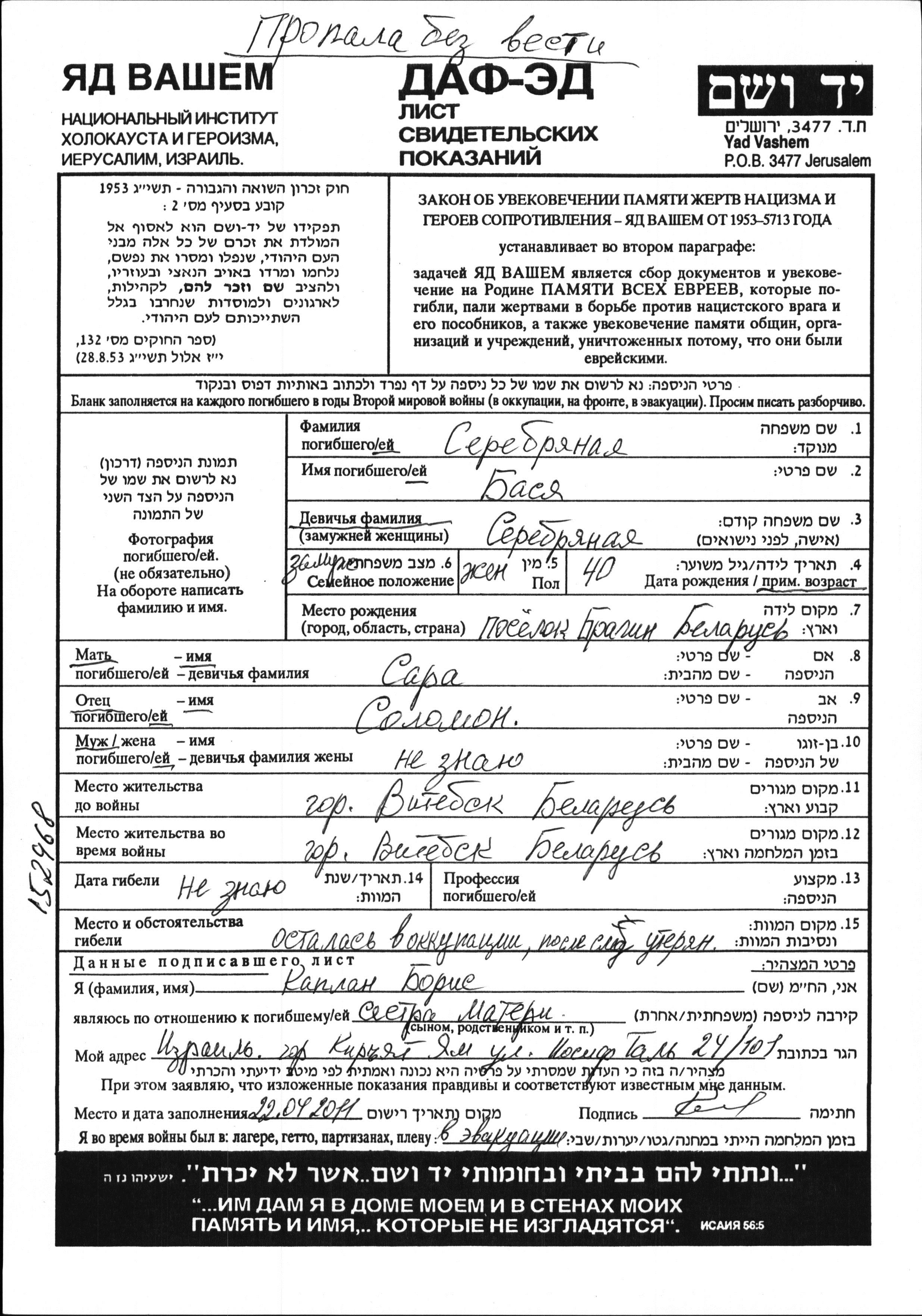 Serebryanaya Basya Vitebsk, Belorussia (USSR) Page of Testimony