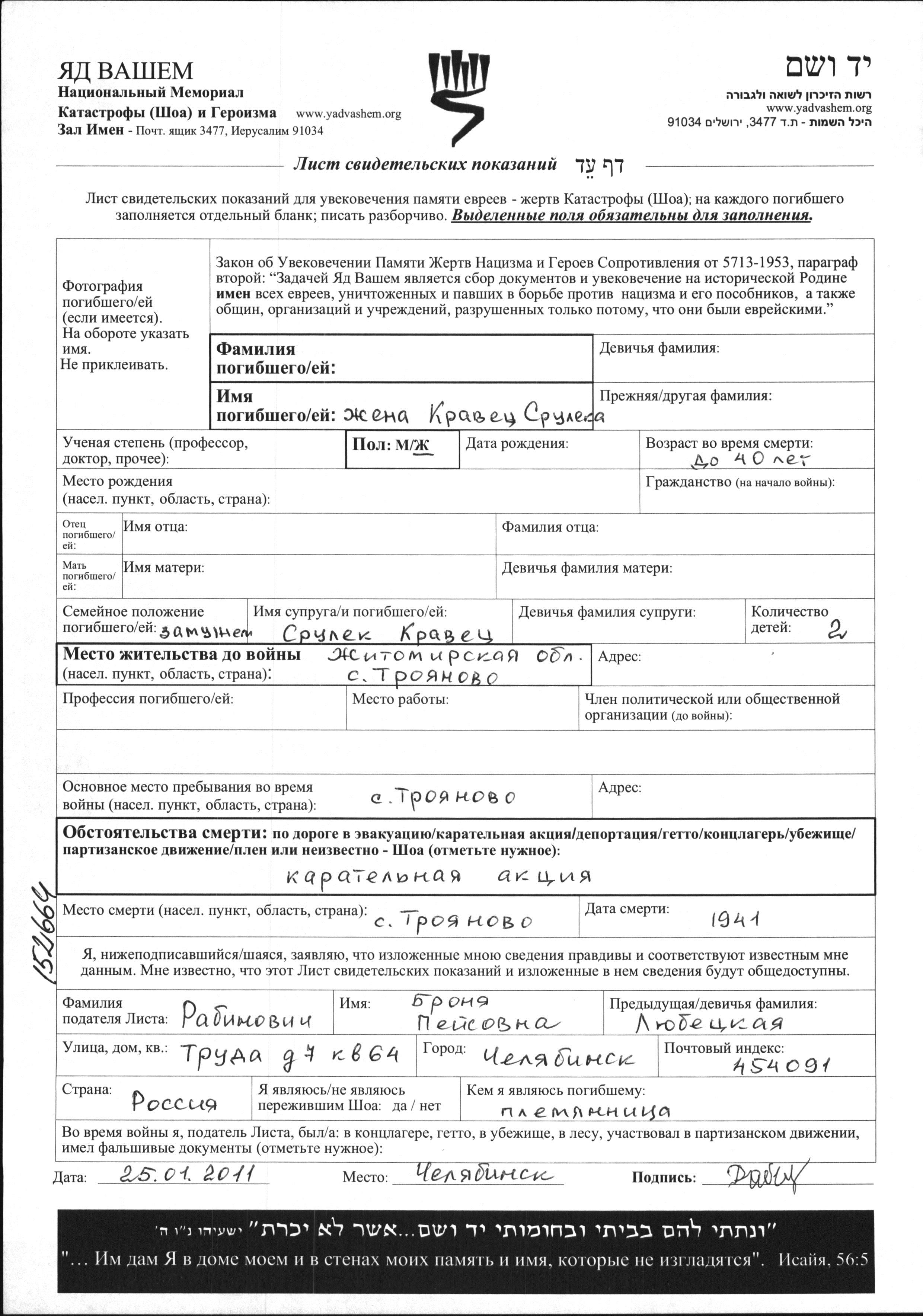 Kravetz First name unknown Troyanov, Ukraine (USSR) Page of Testimony