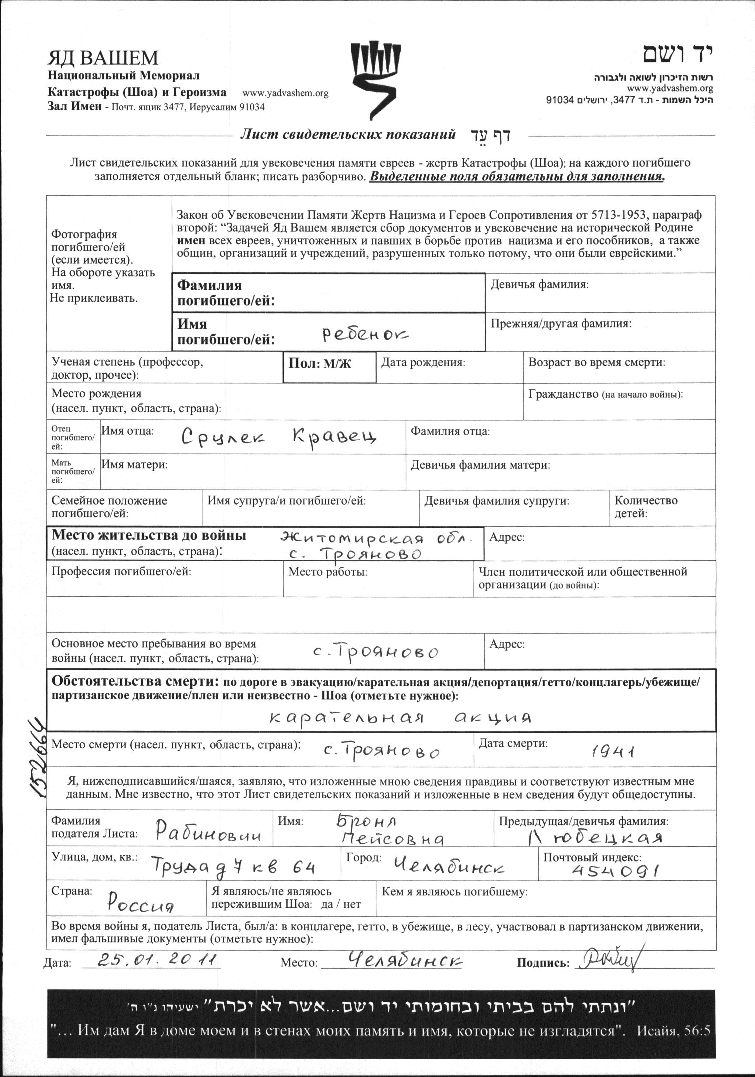 Kravetz First name unknown Troyanov, Ukraine (USSR) Page of Testimony