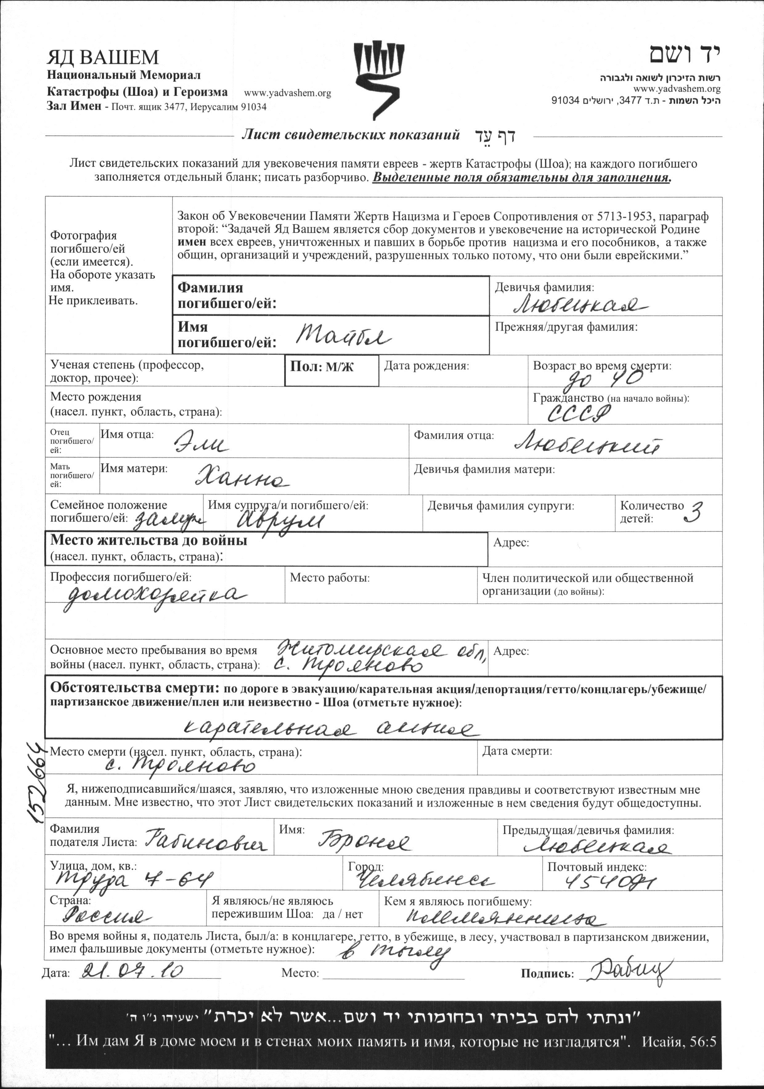 Surname unknown Taybl Troyanov, Ukraine (USSR) Page of Testimony